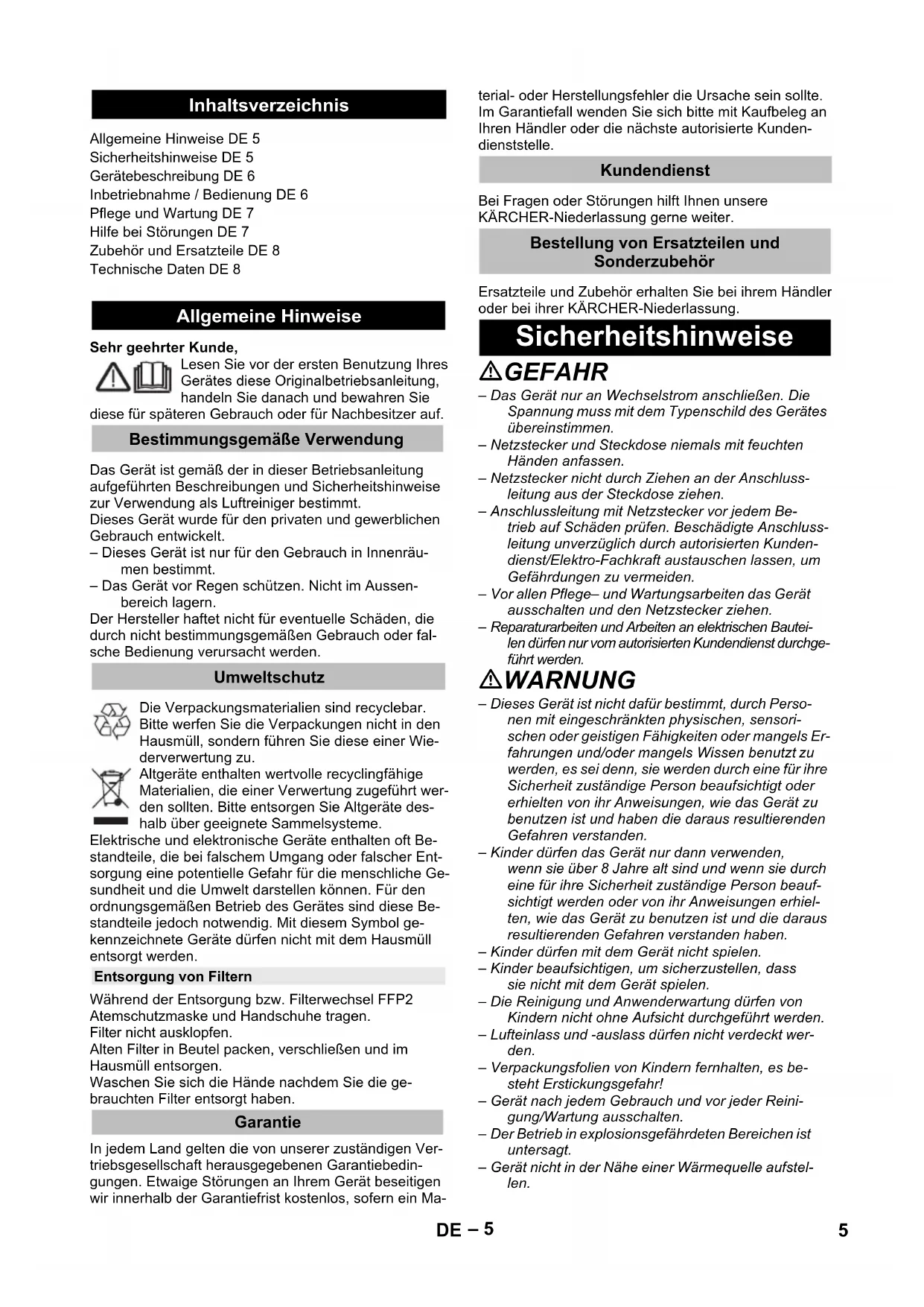 4– 5 Sehr geehrter Kunde, Lesen Sie vor der ersten Benutzung Ihres Gerätes diese Originalbetriebsanleitung, handeln Sie danach und bewahren Sie diese für späteren Gebrauch oder für Nachbesitzer auf. Das Gerät ist gemäß der in dieser Betriebsanleitung aufgeführten Beschreibungen und Sicherheitshinweise zur Verwendung als Luftreiniger bestimmt. Dieses Gerät wurde für den privaten und gewerblichen Gebrauch entwickelt. – Dieses Gerät ist nur für den Gebrauch in Innenräu- men bestimmt. – Das Gerät vor Regen schützen. Nicht im Aussen- bereich lagern. Der Hersteller haftet nicht für eventuelle Schäden, die durch nicht bestimmungsgemäßen Gebrauch oder fal- sche Bedienung verursacht werden. Die Verpackungsmaterialien sind recyclebar. Bitte werfen Sie die Verpackungen nicht in den Hausmüll, sondern führen Sie diese einer Wie- derverwertung zu. Altgeräte enthalten wertvolle recyclingfähige Materialien, die einer Verwertung zugeführt wer- den sollten. Bitte entsorgen Sie Altgeräte des- halb über geeignete Sammelsysteme. Elektrische und elektronische Geräte enthalten oft Be- standteile, die bei falschem Umgang oder falscher Ent- sorgung eine potentielle Gefahr für die menschliche Ge- sundheit und die Umwelt darstellen können. Für den ordnungsgemäßen Betrieb des Gerätes sind diese Be- standteile jedoch notwendig. Mit diesem Symbol ge- kennzeichnete Geräte dürfen nicht mit dem Hausmüll entsorgt werden. Während der Entsorgung bzw. Filterwechsel FFP2 Atemschutzmaske und Handschuhe tragen. Filter nicht ausklopfen. Alten Filter in Beutel packen, verschließen und im Hausmüll entsorgen. Waschen Sie sich die Hände nachdem Sie die ge- brauchten Filter entsorgt haben. In jedem Land gelten die von unserer zuständigen Ver- triebsgesellschaft herausgegebenen Garantiebedin- gungen. Etwaige Störungen an Ihrem Gerät beseitigen wir innerhalb der Garantiefrist kostenlos, sofern ein Ma- terial- oder Herstellungsfehler die Ursache sein sollte. Im Garantiefall wenden Sie sich bitte mit Kaufbeleg an Ihren Händler oder die nächste autorisierte Kunden- dienststelle. Bei Fragen oder Störungen hilft Ihnen unsere KÄRCHER-Niederlassung gerne weiter. Ersatzteile und Zubehör erhalten Sie bei ihrem Händler oder bei ihrer KÄRCHER-Niederlassung. GEFAHR – Das Gerät nur an Wechselstrom anschließen. Die Spannung muss mit dem Typenschild des Gerätes übereinstimmen. – Netzstecker und Steckdose niemals mit feuchten Händen anfassen. – Netzstecker nicht durch Ziehen an der Anschluss- leitung aus der Steckdose ziehen. – Anschlussleitung mit Netzstecker vor jedem Be- trieb auf Schäden prüfen. Beschädigte Anschluss- leitung unverzüglich durch autorisierten Kunden- dienst/Elektro-Fachkraft austauschen lassen, um Gefährdungen zu vermeiden. – Vor allen Pflege– und Wartungsarbeiten das Gerät ausschalten und den Netzstecker ziehen. – Reparaturarbeiten und Arbeiten an elektrischen Bautei- len dürfen nur vom autorisierten Kundendienst durchge- führt werden. WARNUNG – Dieses Gerät ist nicht dafür bestimmt, durch Perso- nen mit eingeschränkten physischen, sensori- schen oder geistigen Fähigkeiten oder mangels Er- fahrungen und/oder mangels Wissen benutzt