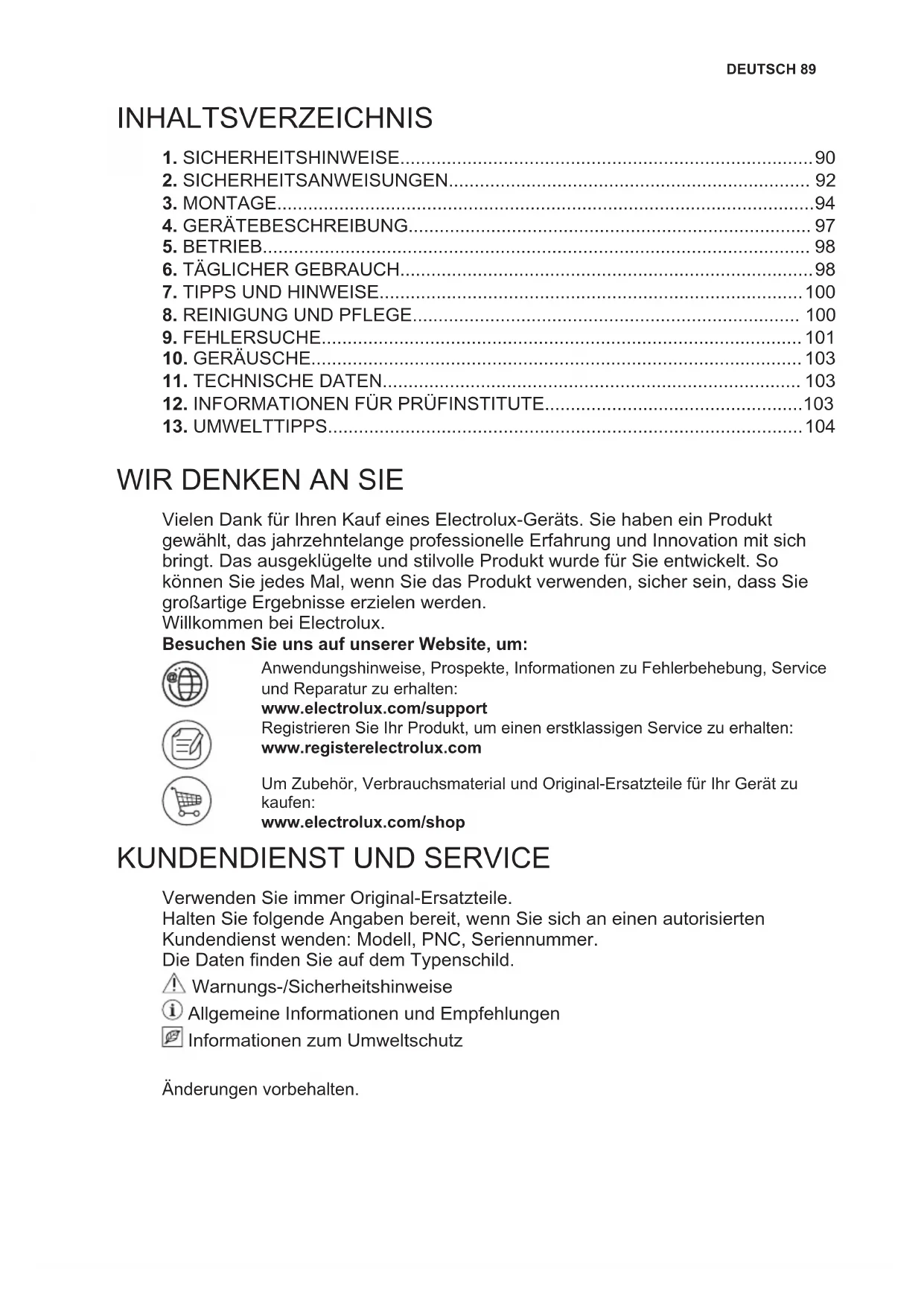 Vielen Dank für Ihren Kauf eines Electrolux-Geräts. Sie haben ein Produkt gewählt, das jahrzehntelange professionelle Erfahrung und Innovation mit sich bringt. Das ausgeklügelte und stilvolle Produkt wurde für Sie entwickelt. So können Sie jedes Mal, wenn Sie das Produkt verwenden, sicher sein, dass Sie großartige Ergebnisse erzielen werden. Willkommen bei Electrolux. Besuchen Sie uns auf unserer Website, um: Anwendungshinweise, Prospekte, Informationen zu Fehlerbehebung, Service und Reparatur zu erhalten: www.electrolux.com/support Registrieren Sie Ihr Produkt, um einen erstklassigen Service zu erhalten: www.registerelectrolux.com Um Zubehör, Verbrauchsmaterial und Original-Ersatzteile für Ihr Gerät zu kaufen: www.electrolux.com/shop