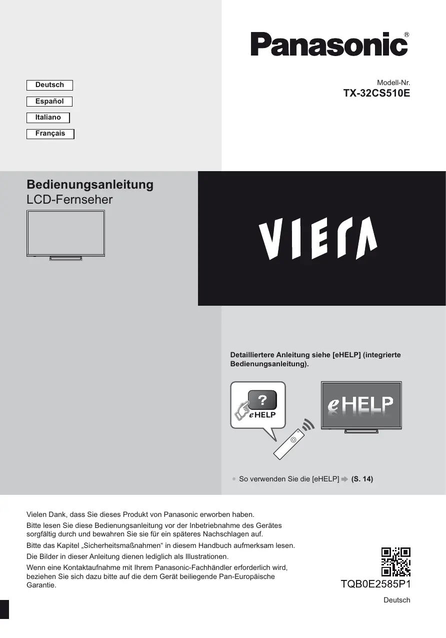 Laden Sie die Anleitung für Ihr Fernsehen kostenlos im PDF-Format! Finden Sie Ihr Handbuch TX-32CS510E - PANASONIC und nehmen Sie Ihr elektronisches Gerät wieder in die Hand. Auf dieser Seite sind alle Dokumente veröffentlicht, die für die Verwendung Ihres Geräts notwendig sind. TX-32CS510E von der Marke PANASONIC.
