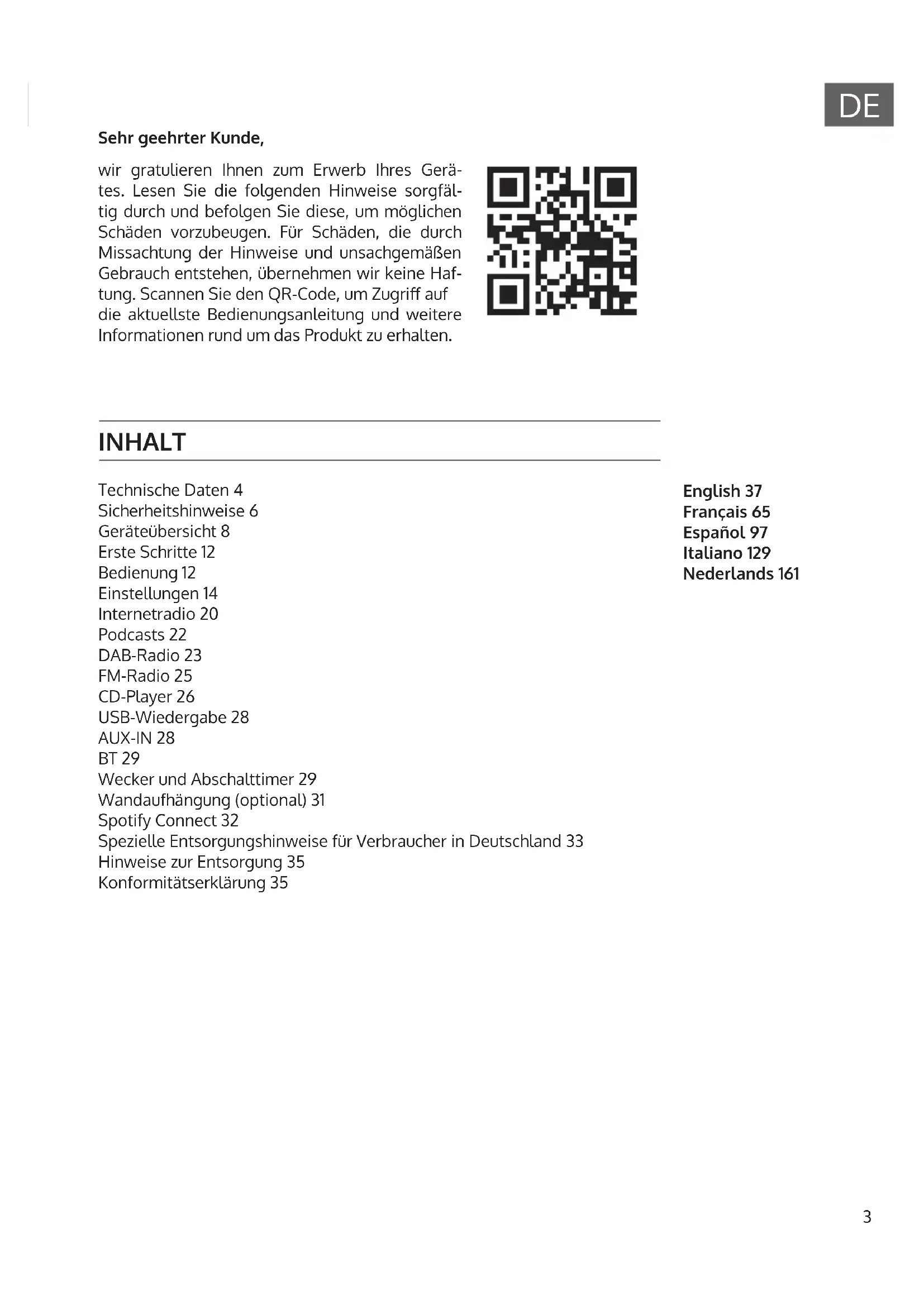 INHALT Technische Daten 4 Sicherheitshinweise 6 Geräteübersicht 8 Erste Schritte 12 Bedienung 12 Einstellungen 14 Internetradio 20 Podcasts 22 DAB-Radio 23 FM-Radio 25 CD-Player 26 USB-Wiedergabe 28 AUX-IN 28 BT 29 Wecker und Abschalttimer 29 Wandaufhängung (optional) 31 Spotify Connect 32 Spezielle Entsorgungshinweise für Verbraucher in Deutschland 33 Hinweise zur Entsorgung 35 Konformitätserklärung 35 Sehr geehrter Kunde, wir gratulieren Ihnen zum Erwerb Ihres Gerä- tes. Lesen Sie die folgenden Hinweise sorgfäl- tig durch und befolgen Sie diese, um möglichen Schäden vorzubeugen. Für Schäden, die durch Missachtung der Hinweise und unsachgemäßen Gebrauch entstehen, übernehmen wir keine Haf- tung. Scannen Sie den QR-Code, um Zugri auf die aktuellste Bedienungsanleitung und weitere Informationen rund um das Produkt zu erhalten. English 37 Français 65 Español 97 Italiano 129 Nederlands 1614