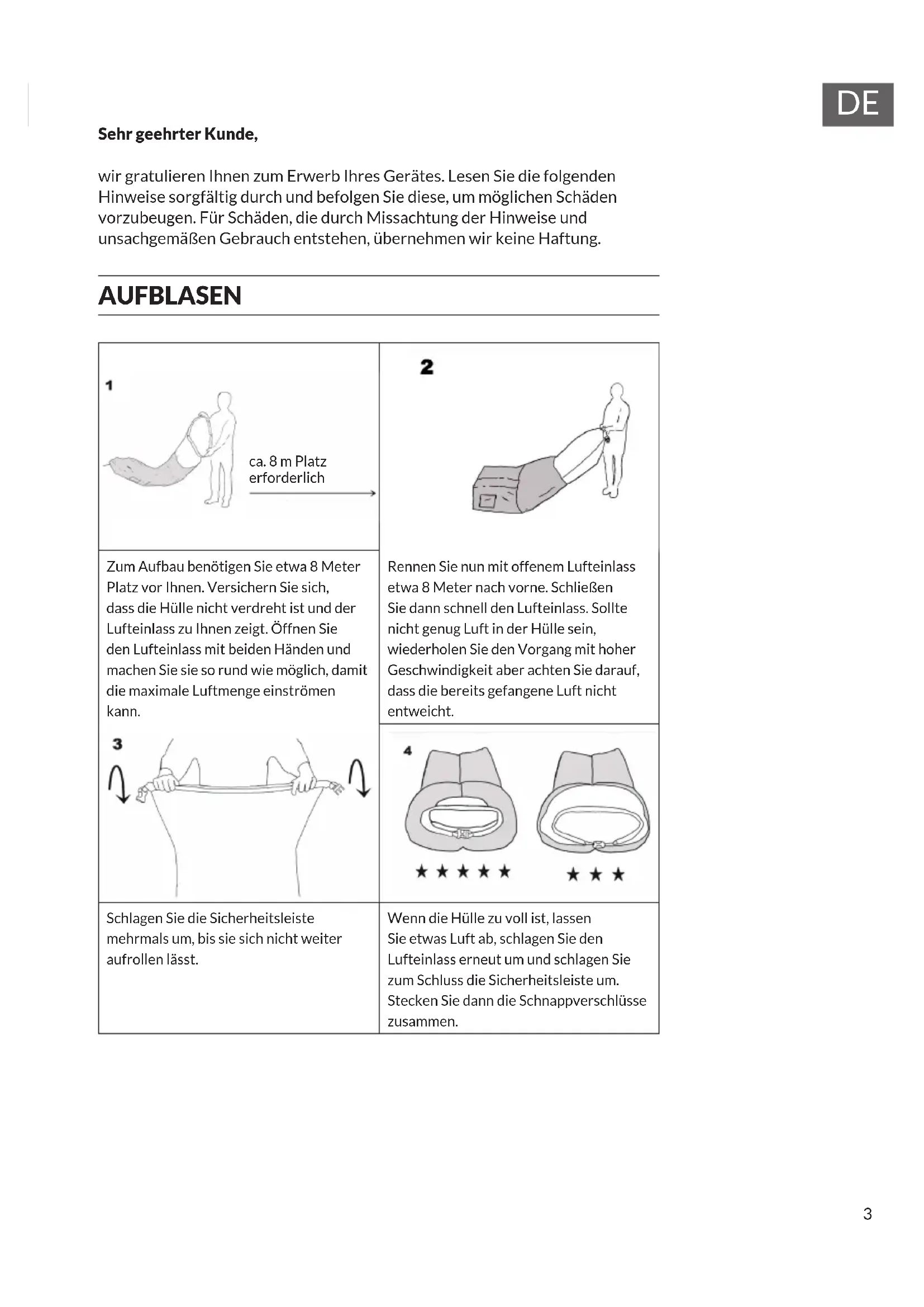 Sehr geehrter Kunde, wir gratulieren Ihnen zum Erwerb Ihres Gerätes. Lesen Sie die folgenden Hinweise sorgfältig durch und befolgen Sie diese, um möglichen Schäden vorzubeugen. Für Schäden, die durch Missachtung der Hinweise und unsachgemäßen Gebrauch entstehen, übernehmen wir keine Haftung. AUFBLASEN Zum Aufbau benötigen Sie etwa 8 Meter Platz vor Ihnen. Versichern Sie sich, dass die Hülle nicht verdreht ist und der Lufteinlass zu Ihnen zeigt. Öffnen Sie den Lufteinlass mit beiden Händen und machen Sie sie so rund wie möglich, damit die maximale Luftmenge einströmen kann. Rennen Sie nun mit offenem Lufteinlass etwa 8 Meter nach vorne. Schließen Sie dann schnell den Lufteinlass. Sollte nicht genug Luft in der Hülle sein, wiederholen Sie den Vorgang mit hoher Geschwindigkeit aber achten Sie darauf, dass die bereits gefangene Luft nicht entweicht. Schlagen Sie die Sicherheitsleiste mehrmals um, bis sie sich nicht weiter aufrollen lässt. Wenn die Hülle zu voll ist, lassen Sie etwas Luft ab, schlagen Sie den Lufteinlass erneut um und schlagen Sie zum Schluss die Sicherheitsleiste um. Stecken Sie dann die Schnappverschlüsse zusammen. ca. 8 m Platz erforderlich4