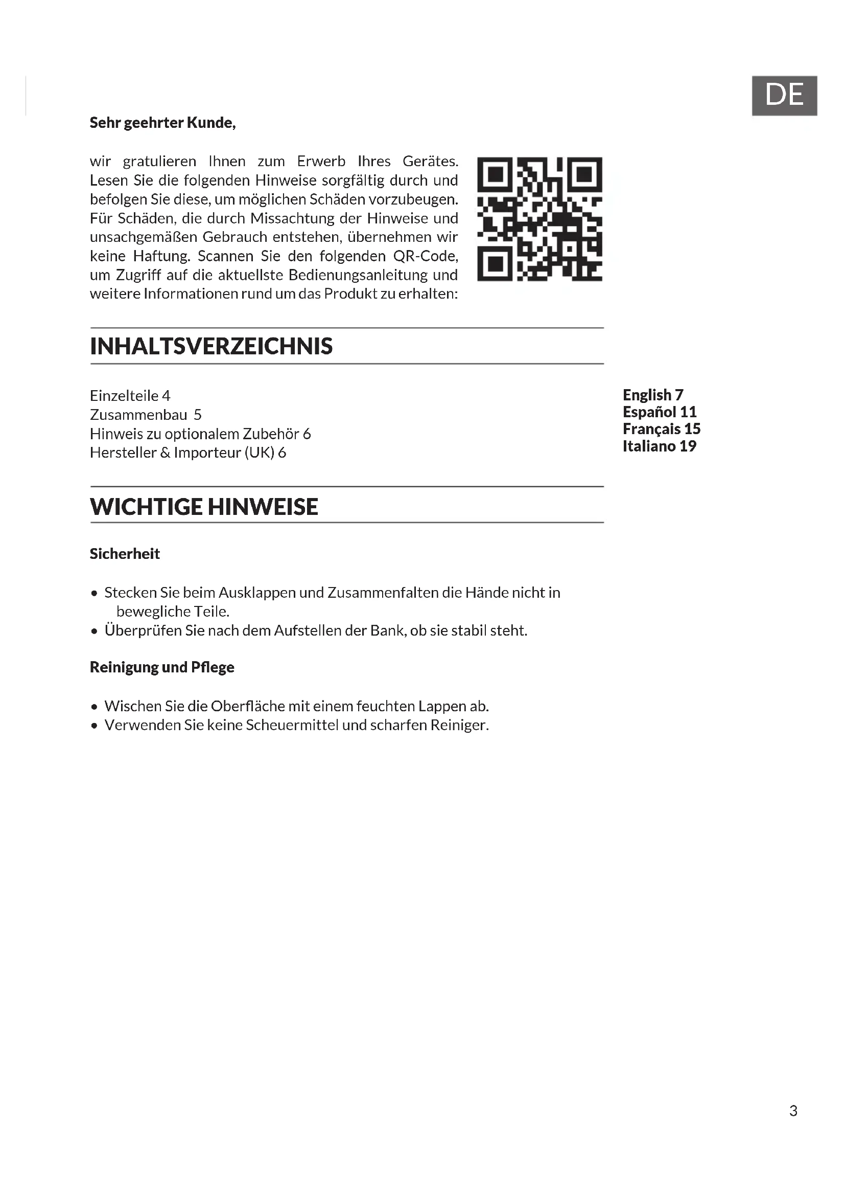 Sehr geehrter Kunde, wir gratulieren Ihnen zum Erwerb Ihres Gerätes. Lesen Sie die folgenden Hinweise sorgfältig durch und befolgen Sie diese, um möglichen Schäden vorzubeugen. Für Schäden, die durch Missachtung der Hinweise und unsachgemäßen Gebrauch entstehen, übernehmen wir keine Haftung. Scannen Sie den folgenden QR-Code, um Zugriff auf die aktuellste Bedienungsanleitung und weitere Informationen rund um das Produkt zu erhalten: INHALTSVERZEICHNIS Einzelteile 4 Zusammenbau 5 Hinweis zu optionalem Zubehör 6 Hersteller & Importeur (UK) 6 WICHTIGE HINWEISE Sicherheit