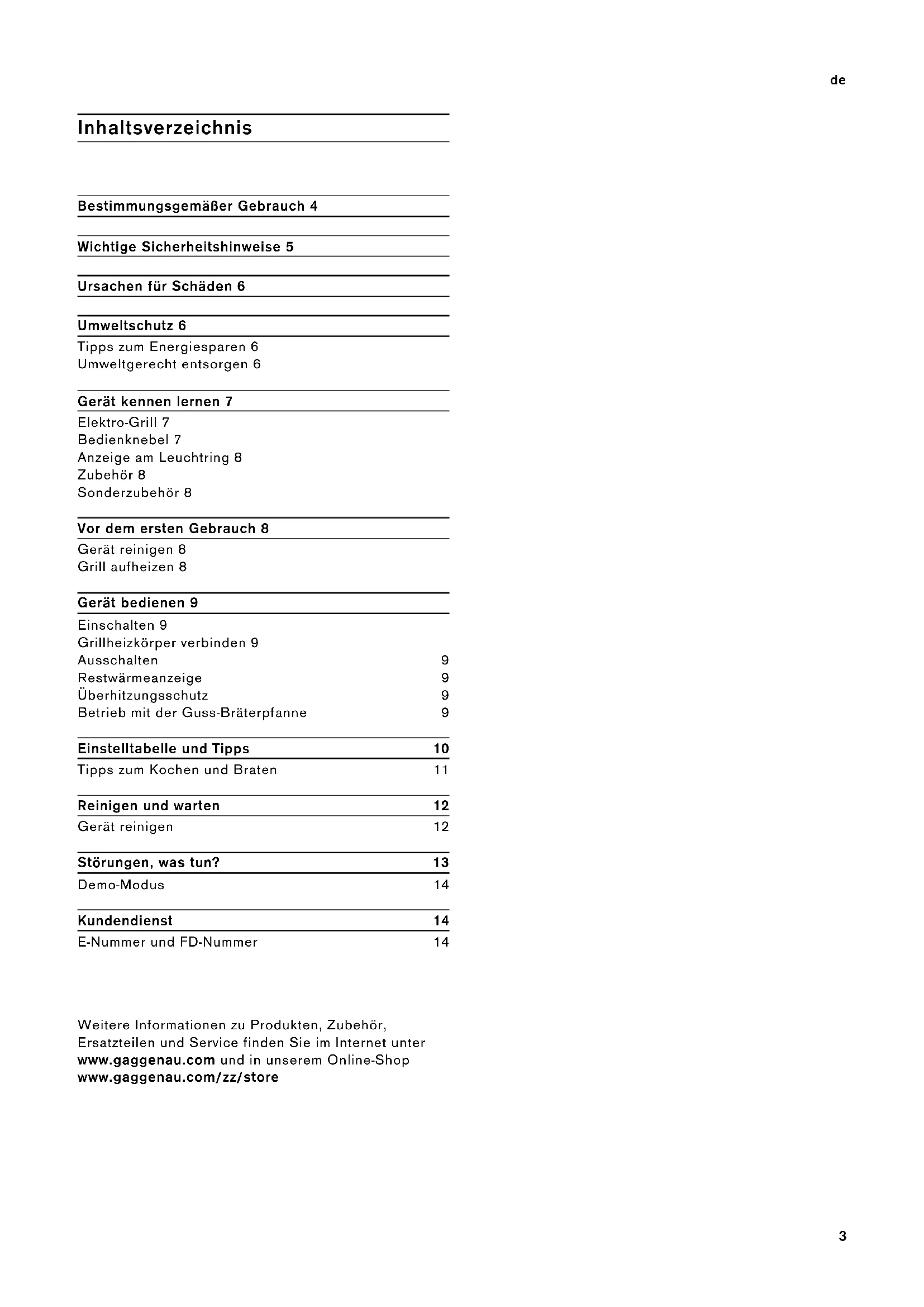 Inhaltsverzeichnis Gebrauchsanleitung Bestimmungsgemäßer Gebrauch 4 Wichtige Sicherheitshinweise 5 Ursachen für Schäden 6 Umweltschutz 6 Tipps zum Energiesparen 6 Umweltgerecht entsorgen 6 Gerät kennen lernen 7 Elektro-Grill 7 Bedienknebel 7 Anzeige am Leuchtring 8 Zubehör 8 Sonderzubehör 8 Vor dem ersten Gebrauch 8 Gerät reinigen 8 Grill aufheizen 8 Gerät bedienen 9 Einschalten 9 Grillheizkörper verbinden 9 Ausschalten 9 Restwärmeanzeige 9 Überhitzungsschutz 9 Betrieb mit der Guss-Bräterpfanne 9 Einstelltabelle und Tipps 10 Tipps zum Kochen und Braten 11 Reinigen und warten 12 Gerät reinigen 12 Störungen, was tun? 13 Demo-Modus 14 Kundendienst 14 E-Nummer und FD-Nummer 14 Weitere Informationen zu Produkten, Zubehör, Ersatzteilen und Service finden Sie im Internet unter www.gaggenau.com und in unserem Online-Shop www.gaggenau.com/zz/store4 de Bestimmungsgemäßer Gebrauch Bestimmungsgemäßer Gebrauch Besti mmungsgemäßer Gebrauch Diese Anleitung sorgfältig lesen. Nur dann können Sie Ihr Gerät sicher und richtig bedienen. Die Gebrauchs- und Montageanleitung für einen späteren Gebrauch oder für Nachbesitzer aufbewahren. Das Gerät nach dem Auspacken prüfen. Bei einem Transportschaden nicht anschließen. Der Einbau des Gerätes muss gemäß der beigefügten Montageanleitung erfolgen. Nur ein konzessionierter Fachmann darf Geräte ohne Stecker anschließen. Bei Schäden durch falschen Anschluss besteht kein Anspruch auf Garantie. Dieses Gerät ist nur für den privaten Haushalt und das häusliche Umfeld bestimmt. Das Gerät nur zum Zubereiten von Speisen und Getränken benutzen. Der Kochvorgang muss beaufsichtigt werden. Ein kurzzeitiger Kochvorgang muss ununterbrochen beaufsichtigt werden. Das Gerät nur in geschlossenen Räumen verwenden. Dieses Gerät nicht auf Booten oder in Fahrzeugen einbauen. Dieses Gerät ist für eine Nutzung bis zu einer Höhe von maximal 2000 Metern über dem Meeresspiegel bestimmt. Benutzen Sie keine ungeeigneten Schutzvorrichtungen oder Kinderschutzgitter. Sie können zu Unfällen führen. Dieses Gerät ist nicht für den Betrieb mit einer externen Zeitschaltuhr oder einer Fernsteuerung bestimmt. Dieses Gerät kann von Kindern ab 8 Jahren und Personen mit reduzierten physischen, sensorischen oder mentalen Fähigkeiten oder Mangel an Erfahrung oder Wissen benutzt werden, wenn sie von einer Person, die für ihre Sicherheit verantwortlich ist, beaufsichtigt oder von ihr bezüglich des sicheren Gebrauchs des Gerätes unterwiesen wurden und sie die daraus resultierenden Gefahren verstanden haben. Kinder dürfen nicht mit dem Gerät spielen. Reinigung und Benutzer-Wartung dürfen nicht durch Kinder durchgeführt werden, es sei denn, sie sind 15 Jahre und älter und werden beaufsichtigt. Kinder jünger als 8 Jahre vom Gerät und der Anschlussleitung fernhalten.5 Wichtige Sicherheitshinweise