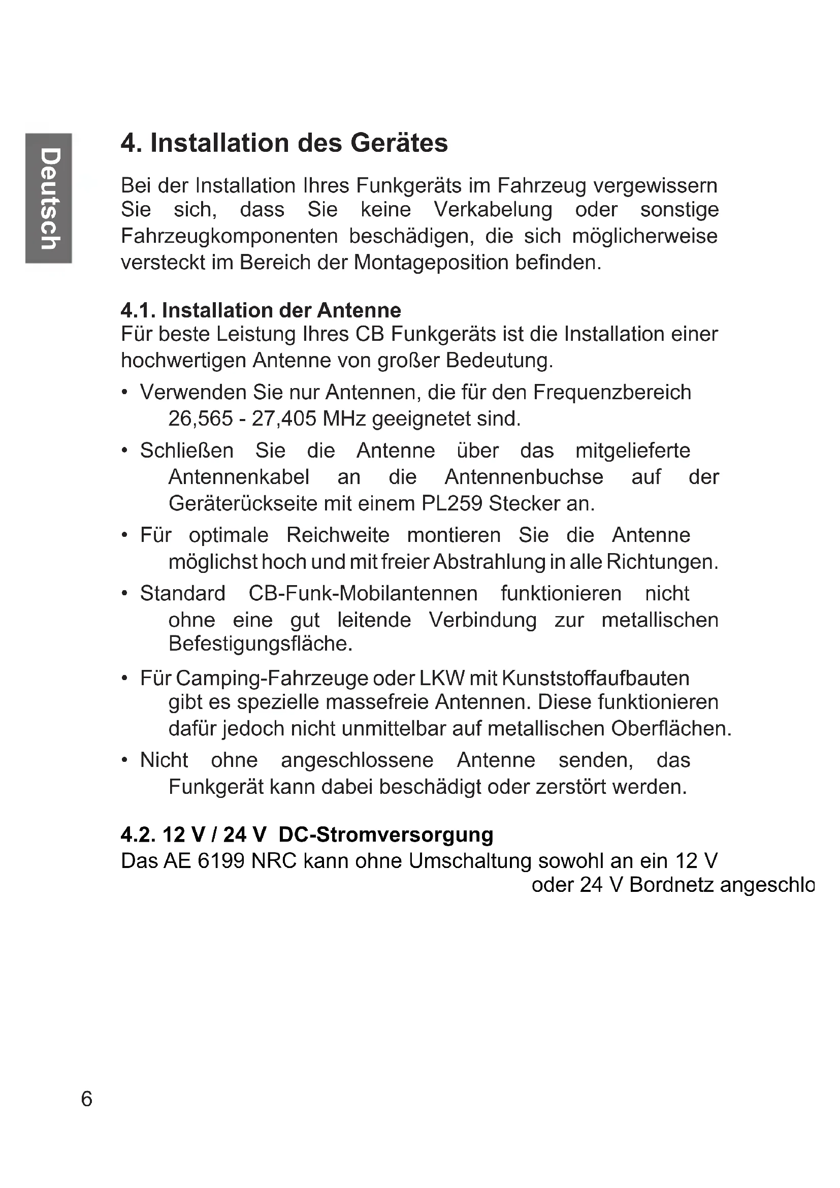 - Nicht ohne angeschlossene Antenne senden, das Funkgerät kann dabei beschädigt oder zerstört werden. 4.2. 4.2. 12 V / 24 V DC-Stromversorgung12 V / 24 V DC-Stromversorgung Das AE 6199 NRC kann ohne Umschaltung sowohl an ein 12 V Das AE 6199 NRC kann ohne Umschaltung sowohl an ein 12 V oder 24 V Bordnetz angeschlossen werden.oder 24 V Bordnetz angeschlossen werden.7 Deutsch