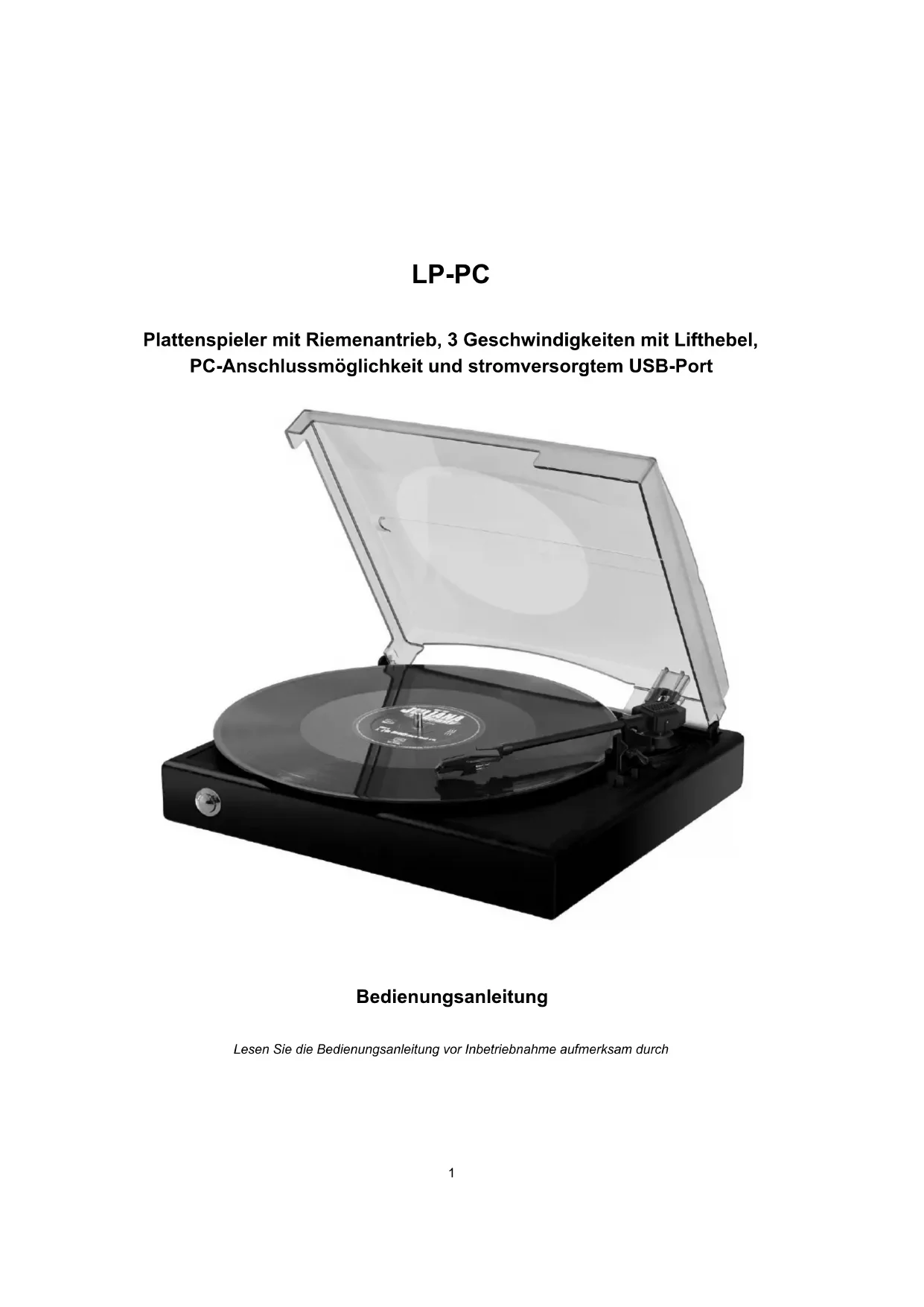 Bedienungsanleitung Lesen Sie die Bedienungsanleitung vor Inbetriebnahme aufmerksam durch2 Schlüsselmerkmale - 33/45/78 U/min umschaltbar - Automatischer/manueller Stopp - Riemenantrieb - 45 U/min Adapter gehört zum Lieferumfang - Lifthebel - RCA-Ausgang (Line) - Automatischer und manueller Stopp - Stromversorgter USB-Port - USB-Kabel und Audacity Software-CD gehören zum Lieferumfang - PC-Anschlussmöglichkeit zur Aufnahme vom Plattenspieler auf Computer Bedienelemente und Funktionen