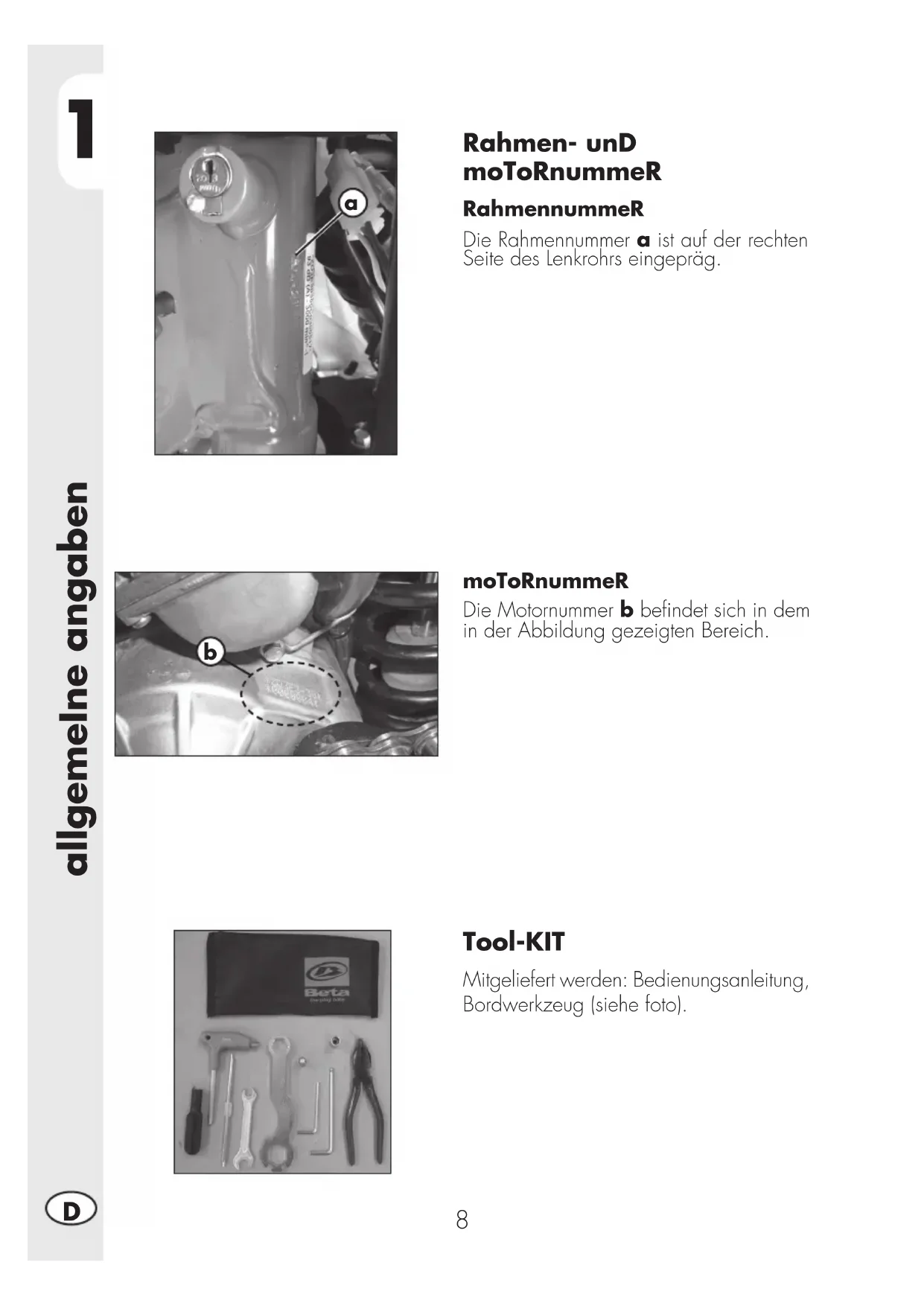 Rahmen- unD moToRnummeR RahmennummeR Die Rahmennummer a ist auf der rechten Seite des Lenkrohrs eingepräg. moToRnummeR Die Motornummer b befindet sich in dem in der Abbildung gezeigten Bereich. Tool-KIT Mitgeliefert werden: Bedienungsanleitung, Bordwerkzeug (siehe foto).