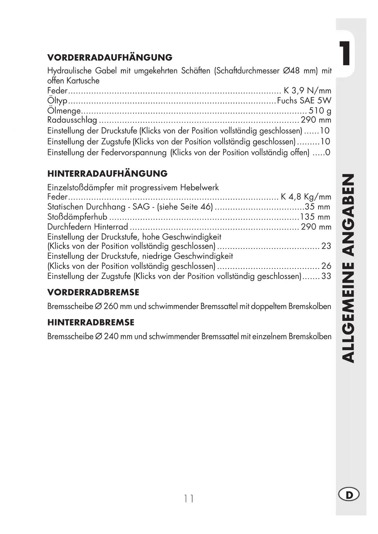 HINTERRADAUFHÄNGUNG Einzelstoßdämpfer mit progressivem Hebelwerk Feder .................................................................................. K 4,8 Kg/mm Statischen Durchhang - SAG - (siehe Seite 46) ...................................35 mm Stoßdämpferhub ..........................................................................135 mm Durchfedern Hinterrad .................................................................. 290 mm Einstellung der Druckstufe, hohe Geschwindigkeit (Klicks von der Position vollständig geschlossen) ........................................ 23 Einstellung der Druckstufe, niedrige Geschwindigkeit (Klicks von der Position vollständig geschlossen) ........................................ 26 Einstellung der Zugstufe (Klicks von der Position vollständig geschlossen) .......33 VORDERRADBREMSE Bremsscheibe Ø 260 mm und schwimmender Bremssattel mit doppeltem Bremskolben HINTERRADBREMSE Bremsscheibe Ø 240 mm und schwimmender Bremssattel mit einzelnem Bremskolben1 ALLGEMEINE ANGABEN