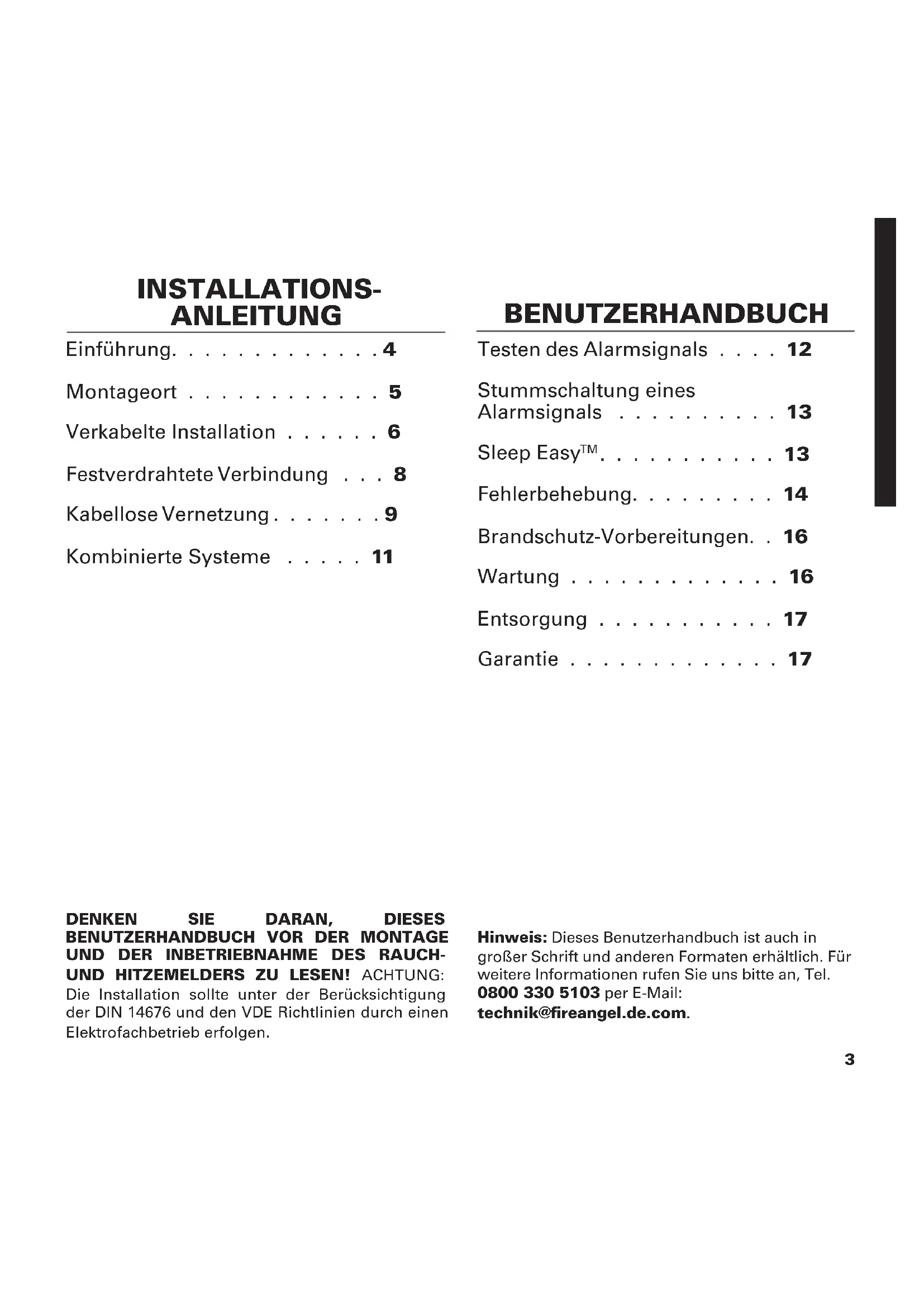 - Garantie BENUTZERHANDBUCH Hinweis: Dieses Benutzerhandbuch ist auch in großer Schrift und anderen Formaten erhältlich. Für weitere Informationen rufen Sie uns bitte an, Tel. 0800 330 5103 per E-Mail: technik@fireangel.de.com.4 EINFÜHRUNG Rauchmelder p. 17