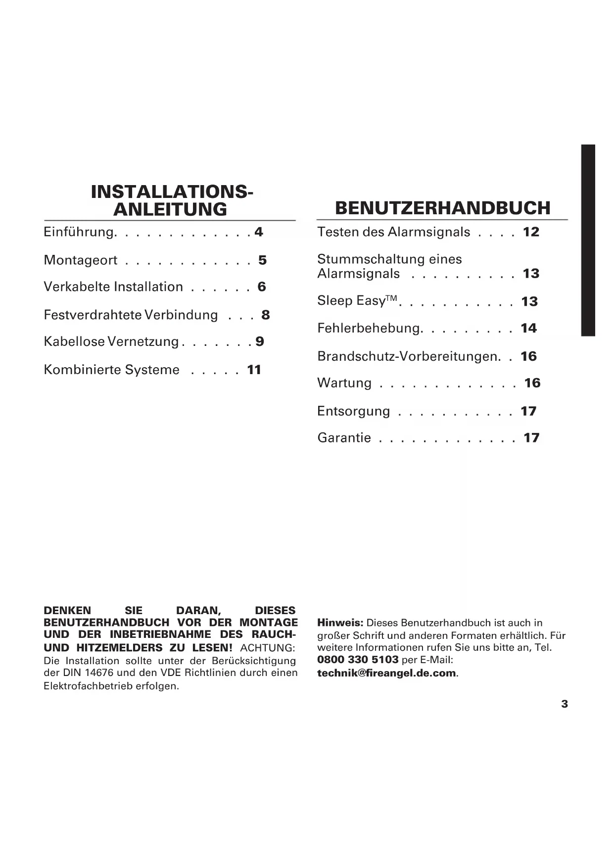 - Garantie BENUTZERHANDBUCH Hinweis: Dieses Benutzerhandbuch ist auch in großer Schrift und anderen Formaten erhältlich. Für weitere Informationen rufen Sie uns bitte an, Tel. 0800 330 5103 per E-Mail: technik@fireangel.de.com.4 EINFÜHRUNG Rauchmelder p. 17