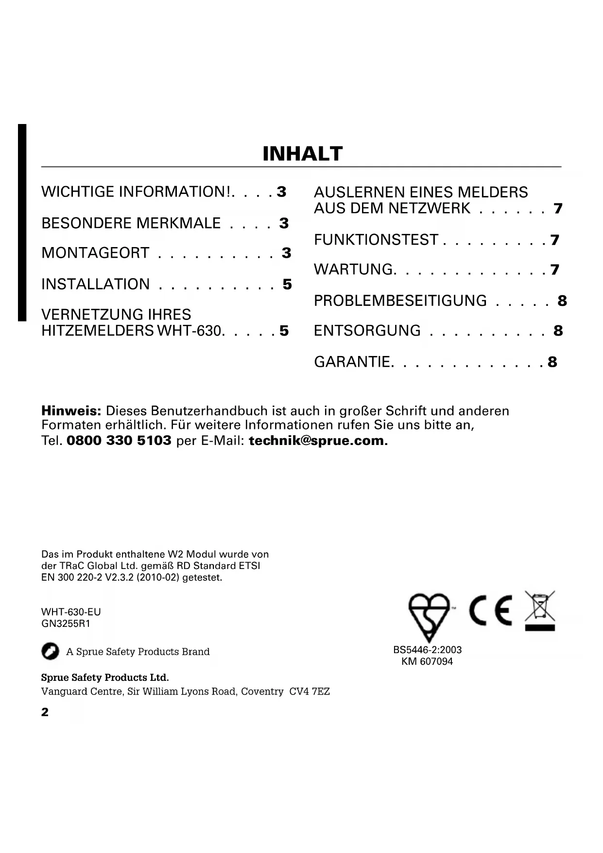 - GARANTIE WHT-630-EUGN3255R1Sprue Safety Products Ltd.Vanguard Centre, Sir William Lyons Road, Coventry CV4 7EZ UKA Sprue Safety Products BrandDas im Produkt enthaltene W2 Modul wurde von der TRaC Global Ltd. gemäß RD Standard ETSI EN 300 220-2 V2.3.2 (2010-02) getestet.BS5446-2:2003KM 6070943 WICHTIGE INFORMATION! WICHTIG: Diese Bedienungsanleitung enthält wichtige Informationen über den Betrieb Ihres FireAngel-Hitzemelders. Lesen Sie diese Bedienungsanleitung vollständig, bevor Sie den Melder installieren und in Betrieb nehmen. Wenn Sie diesen Hitzemelder für die Verwendung durch Dritte installieren, müssen Sie diese Anleitung oder eine Kopie davon dem Endbenutzer aushändigen. Falls die Ursache eines Alarms fraglich ist, gehen Sie immer von einem tatsächlichen Brand aus und befolgen Sie die Feueralarmpläne! BESONDERE MERKMALE p. 8
