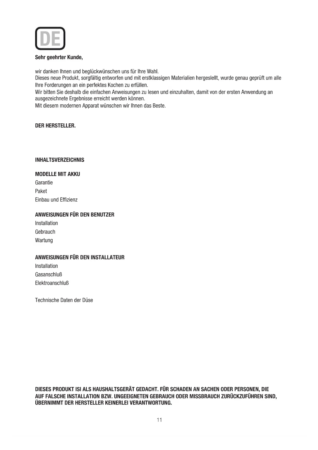 Installation Gasanschluß Elektroanschluß Technische Daten der Düse DIESES PRODUKT ISl ALS HAUSHALTSGERÄT GEDACHT. FÜR SCHADEN AN SACHEN ODER PERSONEN, DIE AUF FALSCHE INSTALLATION BZW. UNGEEIGNETEN GEBRAUCH ODER MISSBRAUCH ZURÜCKZUFÜHREN SIND, ÜBERNIMMT DER HERSTELLER KEINERLEI VERANTWORTUNG. DE12