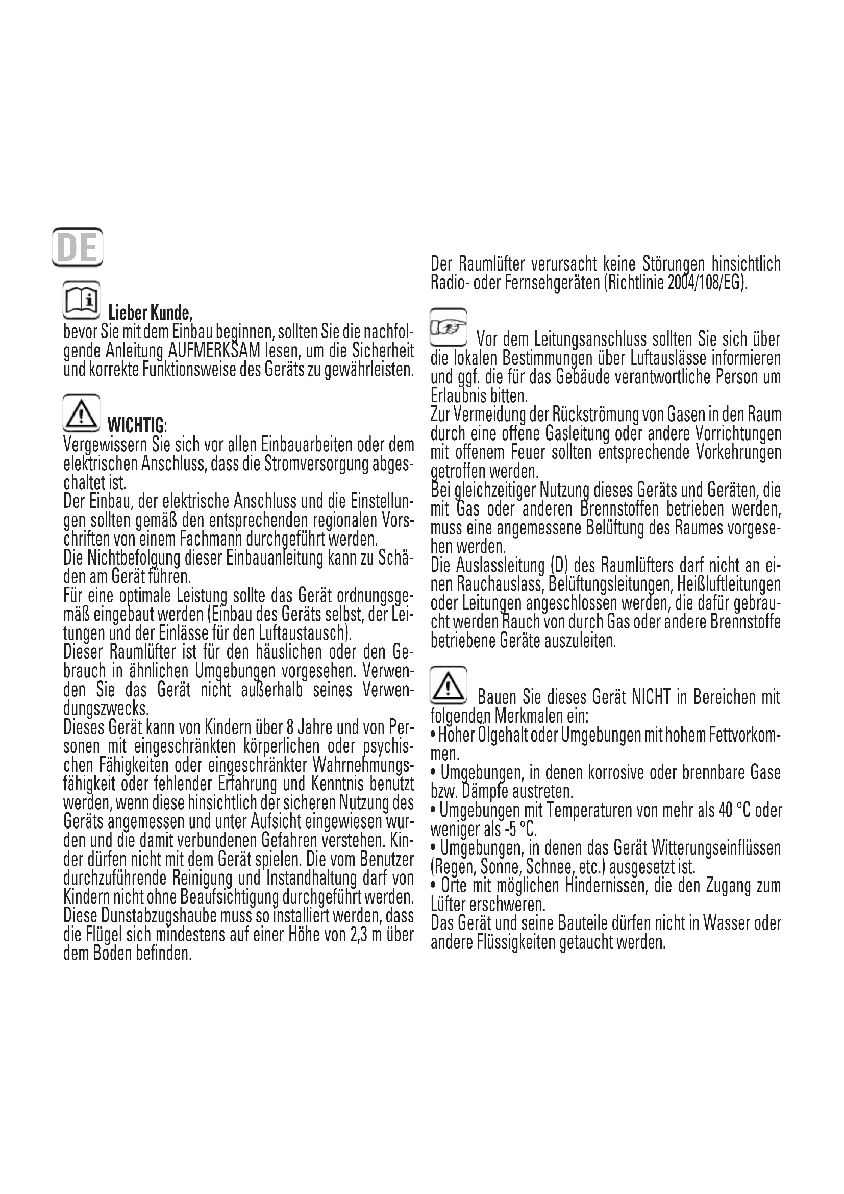 - Orte mit möglichen Hindernissen, die den Zugang zum Lüfter erschweren. Das Gerät und seine Bauteile dürfen nicht in Wasser oder andere Flüssigkeiten getaucht werden. Lieber Kunde, bevor Sie mit dem Einbau beginnen, sollten Sie die nachfol- gende Anleitung AUFMERKSAM lesen, um die Sicherheit und korrekte Funktionsweise des Geräts zu gewährleisten. WICHTIG: Vergewissern Sie sich vor allen Einbauarbeiten oder dem elektrischen Anschluss, dass die Stromversorgung abges- chaltet ist. Der Einbau, der elektrische Anschluss und die Einstellun- gen sollten gemäß den entsprechenden regionalen Vors- chriften von einem Fachmann durchgeführt werden. Die Nichtbefolgung dieser Einbauanleitung kann zu Schä- den am Gerät führen. Für eine optimale Leistung sollte das Gerät ordnungsge- mäß eingebaut werden (Einbau des Geräts selbst, der Lei- tungen und der Einlässe für den Luftaustausch). Dieser Raumlüfter ist für den häuslichen oder den Ge- brauch in ähnlichen Umgebungen vorgesehen. Verwen- den Sie das Gerät nicht außerhalb seines Verwen- dungszwecks. Dieses Gerät kann von Kindern über 8 Jahre und von Per- sonen mit eingeschränkten körperlichen oder psychis- chen Fähigkeiten oder eingeschränkter Wahrnehmungs- fähigkeit oder fehlender Erfahrung und Kenntnis benutzt werden, wenn diese hinsichtlich der sicheren Nutzung des Geräts angemessen und unter Aufsicht eingewiesen wur- den und die damit verbundenen Gefahren verstehen. Kin- der dürfen nicht mit dem Gerät spielen. Die vom Benutzer durchzuführende Reinigung und Instandhaltung darf von Kindern nicht ohne Beaufsichtigung durchgeführt werden. Diese Dunstabzugshaube muss so installiert werden, dass die Flügel sich mindestens auf einer Höhe von 2,3 m über dem Boden befinden. DEDer IP-Schutzgrad kann nur gewährleistet werden, wenn der Einbau des Geräts gemäß der vorliegenden Anleitung durchgeführt wurde. Der Hersteller lehnt jegliche Haftung für Schäden an Per- sonen, Tieren oder Gegenständen ab, die aufgrund unsa- chgemäßer Verwendung durch Missachtung der Warn- hinweise in dieser Anleitung für Einbau, Gebrauch und Wartung des Geräts entstanden sind. Nach Beenden des Einbaus sollte diese Anleitung dem Be- sitzer/Nutzer des Geräts ausgehändigt werden. Es ist notwendig, nach der Installation das Abtrennen des Geräts vom Stromnetz zu ermöglichen. Die Trennung kann durch einen zugänglichen Stecker si- chergestellt werden oder, indem ein Schalter in der fest verlegten Verkabelung eingebaut wird, der die elektris- chen Installationsvorschriften erfüllt. EINBAU: Vor Beginn der Installation ist zu überprüfen, dass die Luftschraube weder verformt noch bes- chädigt ist, dass diese frei dreht und dass sich kein Fremdkörper im Gehäuseinneren befindet. Der Einbau des Geräts wird gemäß der beiliegenden Grafik durchgeführt. Das Gerät kann an der Wand oder an der Decke, mit direktem Auslass oder separater Auslassleitung eingebaut werden (siehe Abbildung 1A). Für den Einbau müssen in Wand oder Decke dem Modell entsprechend eine kreisförmige Öffnung (100 mm, 120 mm oder 150 mm) und Bohrungen zur Befestigung des Gerätes angebracht werden (siehe Abb. 2). Die Abdeckung wie in Abbildung 1B gezeigt entfernen. Die Stromkabel durch das Teil „PC“ und die im Gerät vorgesehene Durchführung führen (siehe Abbildung 3A). Den Anschluss des Geräts wie im Abschnitt “ELEKTRISCHER ANS- CHLUSS“ beschrieben ausführen. Wird die Montage mit einer separaten Auslassleitung durchgeführt, die Leitung (D) von in die angebrachte Öffnung für den Luftauslass setzen. Bei beiden Montagearten (mit separater Auslassleitung oder direktem Auslass) müssen die Luftgitter so installiert werden, dass sie den Sicherheitsbestimmungen Ihres Landes entsprechen, damit kein Zugang zu den Lüfterblättern besteht (siehe Abbildung 1A). Sicherstellen, dass der Luftstrom nicht behindert wird. Die Grundplatte des Gehäuses mit den im Lieferumfang enthaltenen Dübeln und Schrau- ben befestigen. ELEKTRISCHER ANSCHLUSS: Sicherstellen, dass Spannung (V) und Frequenz (Hz) des Stromnetzes, an das das Gerät angeschlossen werden soll, den Werten auf dem Typenschild entsprechen. Das Gerät muss permanent über eine in der Wand eingelassene Verkabelung für feste Installationen angeschlossen werden. Die Leitungen müssen über die Rückseite in das Gerät geführt werden. (Kabel gekippt oder starren, 2 oder 3 Leiter Mindestquerschnitt von 1 mm
