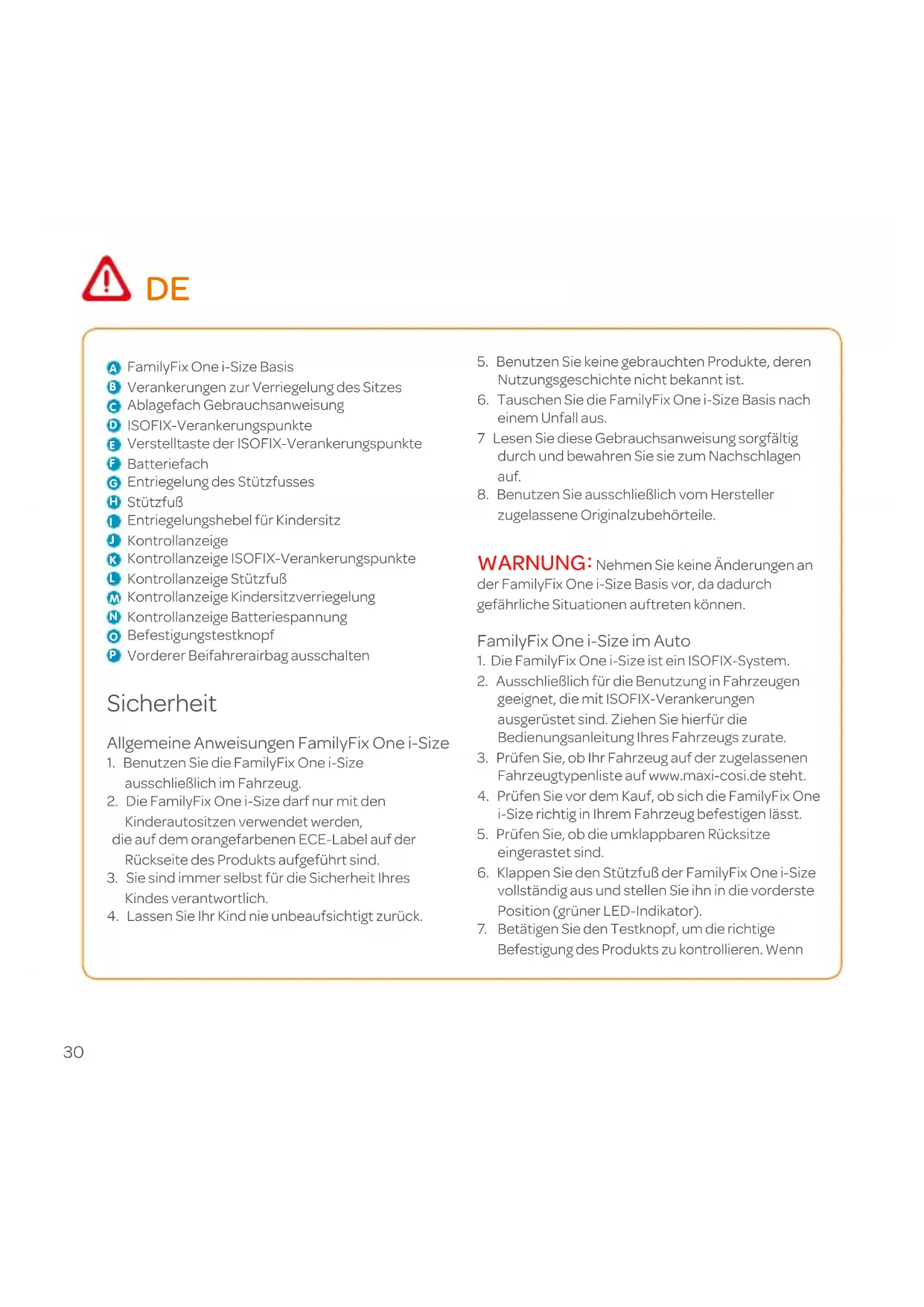 hochwertige neue Batterien aus. Achten Sie beim Einlegen der Batterien auf die richtige Polung (Plus und Minus). Batterien - Bewahren Sie Batterien außer Reichweite von Kindern auf. - Verwenden Sie ausschließlich die empfohlenen Batterien des Typs AA / LR6 (1,5 Volt). Verwenden Sie keine aufladbaren Batterien. - Setzen Sie das Produkt und die Batterien auf keinen Fall Feuer aus. - Verwenden Sie keine alten Batterien oder Batterien, die undichte Stellen oder Risse aufweisen. - Verwenden Sie ausschließlich neue und qualitativ hochwertige Batterien. Umwelt Halten Sie Verpackungsmaterialien aus Plastik außer Reichweite Ihres Kindes, um Erstickungsgefahr zu verhindern. Wenn Sie das Produkt nicht mehr benutzen, bitten wir Sie, das Produkt aus Umweltschutzgründen entsprechend den örtlichen Vorschriften zu entsorgen. Fragen Für Fragen wenden Sie sich bitte an den örtlichen Verkäufer von Maxi-Cosi (für Kontaktdaten siehe www.maxi-cosi.de). Achten Sie in diesem Fall darauf,32 dass Sie folgende Daten zur Hand haben: - Die Seriennummer, die sich unten auf dem orangefarbenen ECE-Aufkleber befindet; - Die Marke, den Fahrzeugtyp und den Sitz, auf dem die FamilyFix One i-Size benutzt wird; - Alter, Größe und Gewicht Ihres Kindes. Garantie Unsere 24-Monats-Garantie zeigt, wie groß unser Vertrauen in die hohe Qualität unserer Design-, Technik-, Produktions- und Produktleistung ist. Wir garantieren, dass dieses Produkt gemäß den aktu- ellen europäischen Sicherheitsanforderungen und Qualitätsstandards hergestellt wurde, die auf dieses Produkt Anwendung finden, und dass dieses Produkt zum Zeitpunkt des Kaufes frei von Material- und Verarbeitungsmängeln ist. Unter den hier beschrie- benen Bedingungen kann diese Garantie von Ver- brauchern in den Ländern, in denen dieses Produkt von einer Tochtergesellschaft der Dorel Group oder einem autorisierten Händler oder Verkäufer verkauft wurde, geltend gemacht werden. Unsere 24-Monats-Garantie erstreckt sich auf Material- und Verarbeitungsmängel bei Verwendung unter normalen Bedingungen und gemäß unserem Benutzerhandbuch für einen Zeitraum von 24 Monaten ab dem Datum des ursprünglichen Einzelhandelskaufs durch den Endkunden. Zur Anforderung von Reparaturen oder Ersatzteilen im Rahmen der Garantie aufgrund von Material- und Verarbeitungsmängeln ist der Nachweis zu erbring- en, dass der Kauf innerhalb von 24 Monate vor dieser Service-Anforderung erfolgt ist. Unsere 24-Monats-Garantie erstreckt sich nicht auf Schäden aufgrund von normalem Verschleiß, Schaden durch Unfälle, missbräuchlicher Verwen- dung Fahrlässigkeit, Feuer, Kontakt mit Flüssigkeiten oder sonstige externe Ursachen, Schaden infolge der Nichtbefolgung des Benutzerhandbuches, Schaden durch Verwendung mit einem anderen Produkt, Schaden aufgrund von Wartung oder Reparatur durch eine Person, die nicht von uns autorisiert wurde, oder Diebstahl des Produktes oder Entfernung oder Änderung eines Etiketts oder einer Kennnummer vom bzw. am Produkt. Beispiele für normalen Verschleiß sind die Abnutzung von Rädern und Gewebe durch regelmäßige Nutzung und die natürliche Farb- und Materialabschwächung über einen längeren Zeitraum und eine längere Nutzungsdauer. Was im Falle von Mängeln zu tun ist: Falls Probleme oder Mängel auftreten, sollten Sie sich für schnellen Service am besten an den von uns au- torisierten Händler oder Verkäufer wenden. Unsere 24-Monats-Garantie wird dort anerkannt (1) . Dazu ist ein Nachweis zu erbringen, dass der Kauf innerhalb von 24 Monaten vor der Service-Anforderung erfolgt ist. Am einfachsten ist es, Ihre Service-Anforderung vorab von unserem Kundenservice genehmigen zu lassen. Wenn Sie unter dieser Garantie einen gültigen Anspruch vorbringen, verlangen wir möglicherweise, dass Sie das Produkt an den von uns autorisierten DE33 Händler oder Verkäufer im Einklang mit unseren Anweisungen zurückgeben. Wir zahlen die Gebühren für Sendung und Rücksendung, wenn alle Anweisun- gen befolgt werden. Schäden und/oder Mängel, die weder von unserer Garantie noch den gesetzlichen Rechten des Verbrauchers abgedeckt sind, und/oder Schäden und/oder Mängel an Produkten, die nicht von unserer Garantie abgedeckt sind, können gegen ein angemessenes Entgelt bearbeitet werden. Rechte des Verbrauchers: Dem Verbraucher stehen die gesetzlichen Rechte gemäß des geltenden Gewährleistungsrechts zu; diese können von Land zu Land variieren. Diese Rechte des Verbrauchers unter geltender nationaler Gesetzgebung werden von dieser Garantie nicht eingeschränkt. Lifetime Warranty: Nach Maßgabe der auf unserer Website www.maxi-cosi.com/lifetimewarranty veröffentli- chten Bedingungen bietet Maxi-Cosi Erstnutzern eine freiwillige Lifetime Warranty des Herstellers. Um diese Lifetime Warranty in Anspruch zu nehmen, müssen Sie sich auf unserer Website registrieren. Diese Garantie wird von Dorel Netherlands bereit- gestellt. Wir sind in den Niederlanden unter der Firmennummer 17060920 eingetragen. Unsere Geschäftsadresse ist Korendijk 5, 5704 RD Helmond, The Netherlands, und unsere Postanschrift ist P.O. Box 6071, 5700 ET Helmond, The Netherlands. Die Namen und Adressen anderer Tochterge- sellschaften der Dorel-Gruppe finden Sie auf der letzten Seite dieses Handbuchs und auf unserer Website für die jeweilige Marke. (1) Produkte, bei denen die Etiketten oder Identifikation- snummern entfernt oder geändert wurden, gelten als nicht zugelassen. Für diese Produkte wird keine Garantie gewährt, da die Echtheit dieser Produkte nicht feststellbar ist. DE34