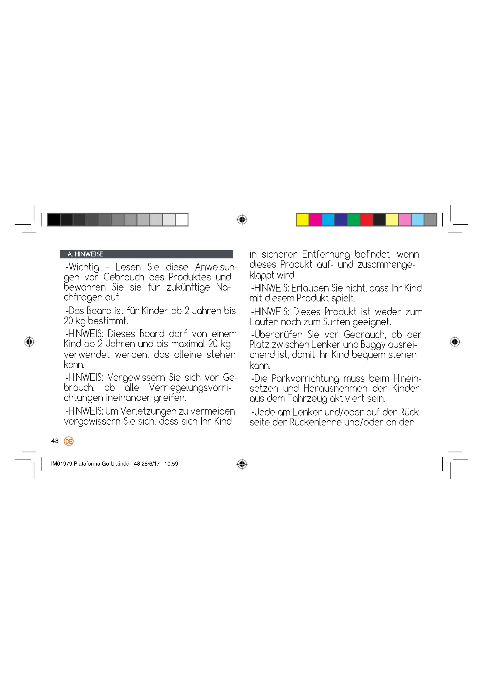 A. HINWEISE -Wichtig – Lesen Sie diese Anweisun- gen vor Gebrauch des Produktes und bewahren Sie sie für zukünftige Na- chfragen auf. -Das Board ist für Kinder ab 2 Jahren bis 20 kg bestimmt. -HINWEIS: Dieses Board darf von einem Kind ab 2 Jahren und bis maximal 20 kg verwendet werden, das alleine stehen kann. -HINWEIS: Vergewissern Sie sich vor Ge- brauch, ob alle Verriegelungsvorri- chtungen ineinander greifen. -HINWEIS: Um Verletzungen zu vermeiden, vergewissern Sie sich, dass sich Ihr Kind in sicherer Entfernung bendet, wenn dieses Produkt auf- und zusammenge- klappt wird. -HINWEIS: Erlauben Sie nicht, dass Ihr Kind mit diesem Produkt spielt. -HINWEIS: Dieses Produkt ist weder zum Laufen noch zum Surfen geeignet. -Überprüfen Sie vor Gebrauch, ob der Platz zwischen Lenker und Buggy ausrei- chend ist, damit Ihr Kind bequem stehen kann. -Die Parkvorrichtung muss beim Hinein- setzen und Herausnehmen der Kinder aus dem Fahrzeug aktiviert sein. -Jede am Lenker und/oder auf der Rück- seite der Rückenlehne und/oder an den IM01979 Plataforma Go Up.indd 48 28/6/17 10:5949
