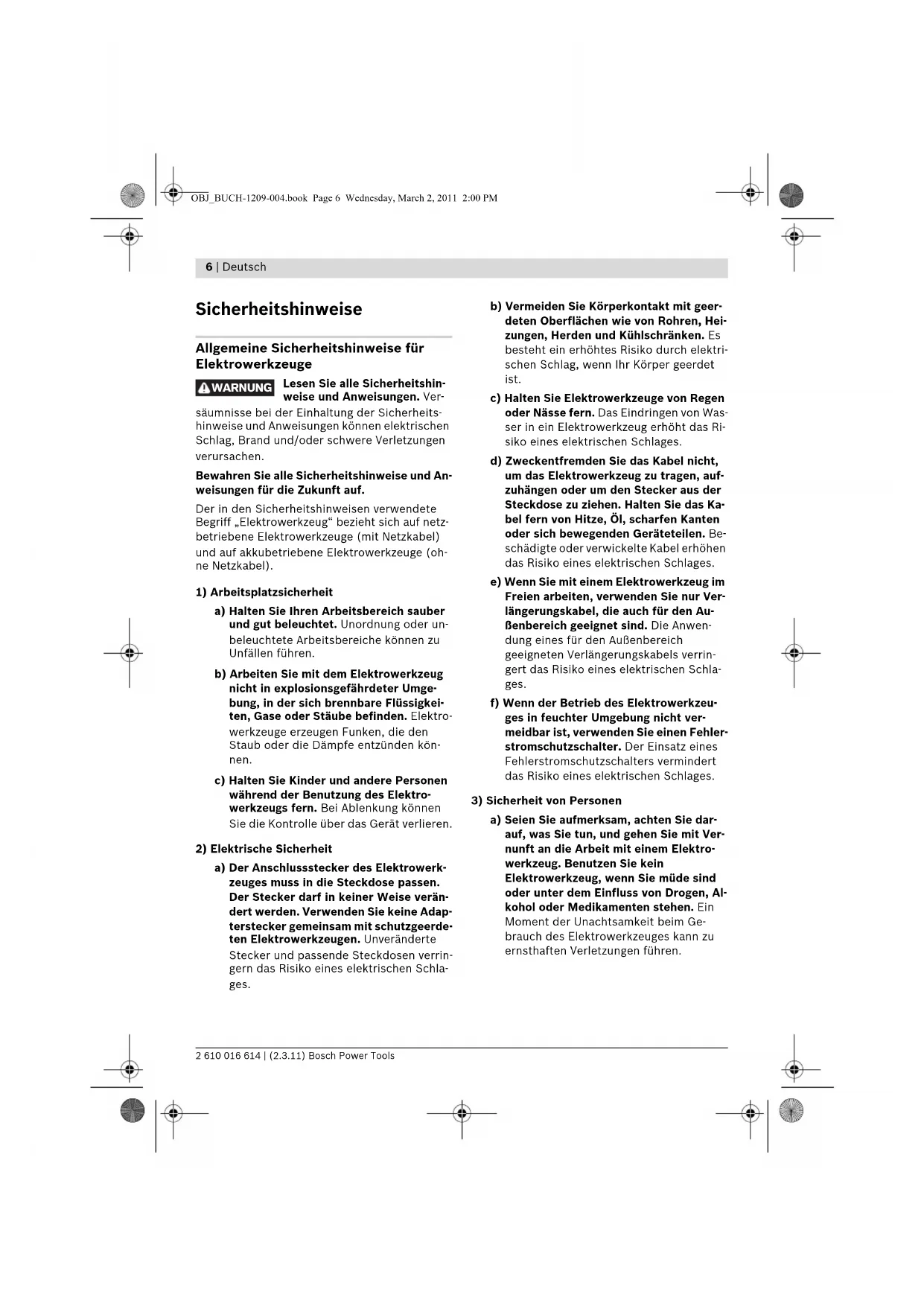 werkzeuges a) Überlasten Sie das Gerät nicht. Verwen- den Sie für Ihre Arbeit das dafür be- stimmte Elektrowerkzeug. Mit dem pas- senden Elektrowerkzeug arbeiten Sie besser und sicherer im angegebenen Leis- tungsbereich. b) Benutzen Sie kein Elektrowerkzeug, des- sen Schalter defekt ist. Ein Elektrowerk- zeug, das sich nicht mehr ein- oder aus- schalten lässt, ist gefährlich und muss repariert werden. c) Ziehen Sie den Stecker aus der Steckdo- se und/oder entfernen Sie den Akku, be- vor Sie Geräteeinstellungen vornehmen, Zubehörteile wechseln oder das Gerät weglegen. Diese Vorsichtsmaßnahme ver- hindert den unbeabsichtigten Start des Elektrowerkzeuges. d) Bewahren Sie unbenutzte Elektrowerk- zeuge außerhalb der Reichweite von Kin- dern auf. Lassen Sie Personen das Gerät nicht benutzen, die mit diesem nicht ver- traut sind oder diese Anweisungen nicht gelesen haben. Elektrowerkzeuge sind gefährlich, wenn sie von unerfahrenen Personen benutzt werden. e) Pflegen Sie Elektrowerkzeuge mit Sorg- falt. Kontrollieren Sie, ob bewegliche Teile einwandfrei funktionieren und nicht klemmen, ob Teile gebrochen oder so beschädigt sind, dass die Funktion des Elektrowerkzeuges beeinträchtigt ist. Lassen Sie beschädigte Teile vor dem Einsatz des Gerätes reparieren. Viele Un- fälle haben ihre Ursache in schlecht ge- warteten Elektrowerkzeugen. f) Halten Sie Schneidwerkzeuge scharf und sauber. Sorgfältig gepflegte Schneid- werkzeuge mit scharfen Schneidkanten verklemmen sich weniger und sind leich- ter zu führen. OBJ_BUCH-1209-004.book Page 7 Wednesday, March 2, 2011 2:00 PM8 | Deutsch 2 610 016 614 | (2.3.11) Bosch Power Tools g) Verwenden Sie Elektrowerkzeug, Zube- hör, Einsatzwerkzeuge usw. entspre- chend diesen Anweisungen. Berücksich- tigen Sie dabei die Arbeitsbedingungen und die auszuführende Tätigkeit. Der Ge- brauch von Elektrowerkzeugen für andere als die vorgesehenen Anwendungen kann zu gefährlichen Situationen führen.