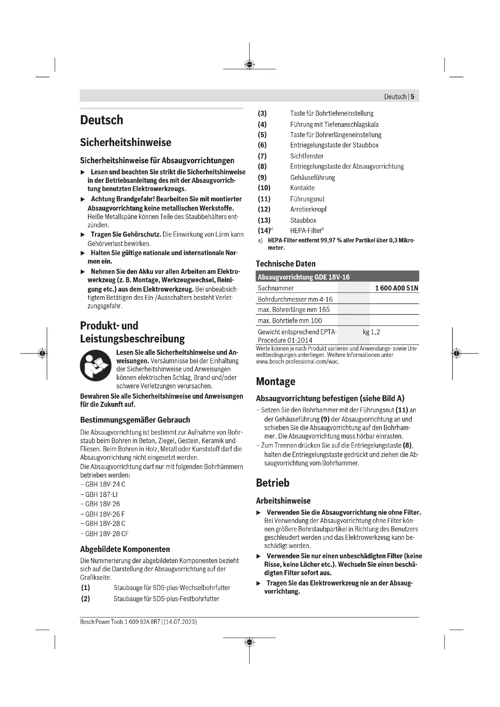 HEPA-Filter entfernt 99,97 % aller Partikel über 0,3 Mikro- meter. Technische Daten Absaugvorrichtung GDE 18V-16 Sachnummer 1600A0051N Bohrdurchmesser mm 4-16 max. Bohrerlänge mm 165 max. Bohrtiefe mm 100 Gewicht entsprechend EPTA- Procedure 01:2014 kg 1,2 Werte können je nach Produkt variieren und Anwendungs- sowie Um- weltbedingungen unterliegen. Weitere Informationen unter www.bosch-professional.com/wac. Montage Absaugvorrichtung befestigen (siehe Bild A) – Setzen Sie den Bohrhammer mit der Führungsnut (11) an der Gehäuseführung (9) der Absaugvorrichtung an und schieben Sie die Absaugvorrichtung auf den Bohrham- mer. Die Absaugvorrichtung muss hörbar einrasten. – Zum Trennen drücken Sie auf die Entriegelungstaste (8), halten die Entriegelungstaste gedrückt und ziehen die Ab- saugvorrichtung vom Bohrhammer. Betrieb Arbeitshinweise u Verwenden Sie die Absaugvorrichtung nie ohne Filter. Bei Verwendung der Absaugvorrichtung ohne Filter kön- nen größere Bohrstaubpartikel in Richtung des Benutzers geschleudert werden und das Elektrowerkzeug kann be- schädigt werden. u Verwenden Sie nur einen unbeschädigten Filter (keine Risse, keine Löcher etc.). Wechseln Sie einen beschä- digten Filter sofort aus. u Tragen Sie das Elektrowerkzeug nie an der Absaug- vorrichtung. Bosch Power Tools 1 609 92A 8R7 | (14.07.2023)6 | Deutsch u Halten Sie das Elektrowerkzeug mit montierter Ab- saugvorrichtung während des Betriebs nicht an der Absaugvorrichtung, sondern immer an Handgriff und Zusatzgriff des Elektrowerkzeugs. Hinweis: Die Führung (4) ist federgespannt. Beim Drücken der Taste (5) für Bohrerlängeneinstellung kann die Führung nach vorn schnellen. u Halten Sie das Elektrowerkzeug beim Arbeiten fest mit beiden Händen und sorgen Sie für einen sicheren Stand. Das Elektrowerkzeug wird mit zwei Händen siche- rer geführt. Bohrer einsetzen/entnehmen (siehe Bild B) – Drücken Sie die Taste (5) für Bohrerlängeneinstellung und ziehen Sie die Führung (4) bis zum Anschlag nach au- ßen. – Lassen Sie die Taste (5) wieder los. – Schieben Sie die Bohrerspitze von hinten durch das Staubauge(2) und setzen Sie ihn danach in das Bohrfut- ter entsprechend den Anweisungen Ihres Elektrowerk- zeugs ein. – Vor dem Entnehmen des Bohrers drücken Sie wieder die Taste (5) und ziehen die Führung (4) bis zum Anschlag nach außen. Führungslänge einstellen (siehe Bild C) Für eine saubere Absaugung und eine korrekte Einstellung des Tiefenanschlags muss die Füh- rung (4) so eingestellt werden, dass die Boh- rerspitze vorn mit dem Staubauge (1)/(2) bün- dig ist. – Setzen Sie den gewünschten Bohrer in die Werkzeugauf- nahme des Bohrfutters ein. – Drücken Sie die Taste (5), während Sie die Führung (4) entsprechend der Bohrerlänge einstellen. – Lassen Sie die Taste (5) wieder los. Hinweis: Zum Aufbewahren der Absaugvorrichtung drücken Sie die Taste (5) und ziehen die Führung (4) bis zum An- schlag nach außen. Dadurch wird die Feder der Führung ent- lastet und die Lebensdauer der Feder erhöht. Bohrtiefe einstellen (siehe Bild D) Mit der Taste (3) für die Tiefenanschlageinstellung kann die gewünschte Bohrtiefe X festgelegt werden. – Drücken Sie die Taste (3) und verschieben Sie die Taste so auf der Führung (4), dass der im Bild gezeigte Abstand X Ihrer gewünschten Bohrtiefe entspricht. – Lassen Sie die Taste (3) wieder los. Staubauge wechseln (siehe Bilder E) Je nach Bohrfutter und Bohrdurchmesser müssen Sie das Staubauge wechseln: – Staubauge(1) für ein SDS-plus-Wechselbohrfutter und Bohrdurchmesser 4−16mm – Staubauge(2) für ein SDS-plus-Festbohrfutter und Bohr- durchmesser 4−16mm Darüberhinaus müssen Sie das Staubauge wechseln, wenn dessen Wandauflagefläche deutliche Verschleißspuren auf- weist und dadurch beim Absaugen Staub durch die Absaug- bürste entweicht. Staubauge entnehmen: – Drücken Sie auf den Arretierknopf (12) und ziehen Sie das Staubauge nach oben aus der Halterung. Staubauge montieren: – Stecken Sie das neue Staubauge von oben in die Halte- rung, bis der Arretierknopf (12) hörbar einrastet. Staubbox entleeren (siehe Bilder F1−F2) Hinweis: Tragen Sie bei der Wartung und Reinigung der Staubbox eine Staubschutzmaske. Leeren Sie die Staubbox (13) regelmäßig sowie nach Ab- schluss der Arbeiten, um die optimale Leistungsfähigkeit der Absaugung zu erhalten. Mit Hilfe des Sichtfensters (7) kön- nen Sie den Füllstand der Staubbox kontrollieren. – Halten Sie das Elektrowerkzeug mit der Absaugvorrich- tung waagerecht und schalten Sie das Elektrowerkzeug für einige Sekunden ein. Dadurch werden Staubreste aus dem Absaugkanal in die Staubbox (13) gesaugt. – Drücken Sie die sowohl die linke als auch die rechte Ent- riegelungstaste (6) und ziehen Sie die Staubbox (13) aus der Absaugvorrichtung. – Nehmen Sie gegebenenfalls den HEPA-Filter (14) aus der Staubbox und klopfen Sie ihn vorsichtig aus oder bürsten Sie die Filterlamellen mit einem weichen Besen ab. Hinweis: Reinigen Sie den HEPA-Filter nicht mit Wasser oder durch Ausblasen mit Druckluft. – Schütteln Sie die Staubbox (13) über einem geeigneten Abfallbehälter aus. – Stecken Sie den HEPA-Filter (14) nach der Reinigung wieder in die Staubbox (13). Schieben Sie anschließend die Staubbox in die Absaugvorrichtung, bis die Entriege- lungstasten (6) hörbar einrasten. Wartung und Service Wartung und Reinigung – Reinigen Sie die Absaugvorrichtung mit einem trockenen, weichen Tuch. Kundendienst und Anwendungsberatung Der Kundendienst beantwortet Ihre Fragen zu Reparatur und Wartung Ihres Produkts sowie zu Ersatzteilen. Explosions- zeichnungen und Informationen zu Ersatzteilen finden Sie auch unter: www.bosch-pt.com Das Bosch-Anwendungsberatungs-Team hilft Ihnen gerne bei Fragen zu unseren Produkten und deren Zubehör. 1 609 92A 8R7 | (14.07.2023) Bosch Power ToolsEnglish | 7 Geben Sie bei allen Rückfragen und Ersatzteilbestellungen bitte unbedingt die 10-stellige Sachnummer 
