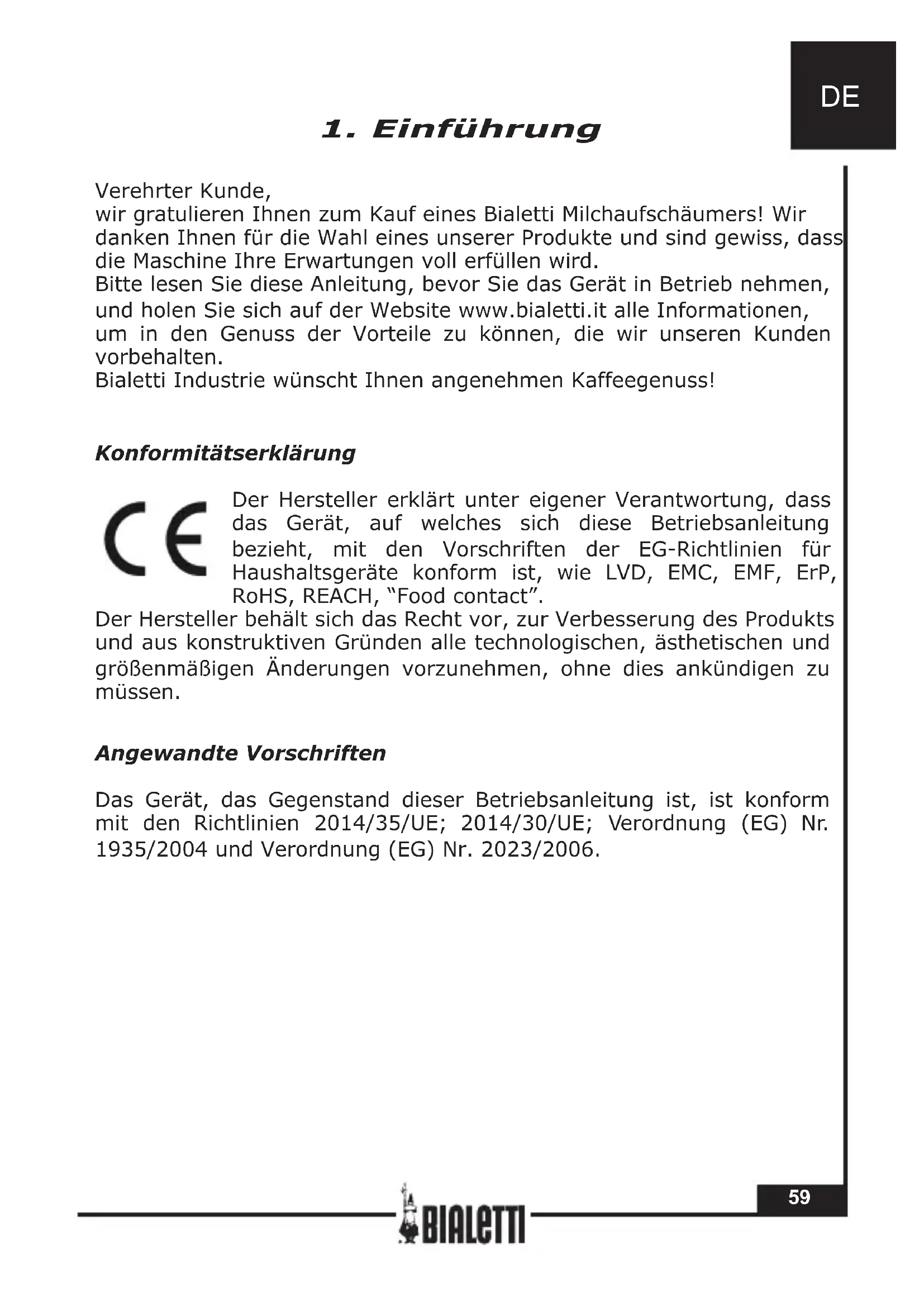 Verehrter Kunde, wir gratulieren Ihnen zum Kauf eines Bialetti Milchaufschäumers! Wir danken Ihnen für die Wahl eines unserer Produkte und sind gewiss, dass die Maschine Ihre Erwartungen voll erfüllen wird. Bitte lesen Sie diese Anleitung, bevor Sie das Gerät in Betrieb nehmen, und holen Sie sich auf der Website www.bialetti.it alle Informationen, um in den Genuss der Vorteile zu können, die wir unseren Kunden vorbehalten. Bialetti Industrie wünscht Ihnen angenehmen Kaffeegenuss! Konformitätserklärung Der Hersteller erklärt unter eigener Verantwortung, dass das Gerät, auf welches sich diese Betriebsanleitung bezieht, mit den Vorschriften der EG-Richtlinien für Haushaltsgeräte konform ist, wie LVD, EMC, EMF, ErP, RoHS, REACH, “Food contact”. Der Hersteller behält sich das Recht vor, zur Verbesserung des Produkts und aus konstruktiven Gründen alle technologischen, ästhetischen und größenmäßigen Änderungen vorzunehmen, ohne dies ankündigen zu müssen. Angewandte Vorschriften Das Gerät, das Gegenstand dieser Betriebsanleitung ist, ist konform mit den Richtlinien 2014/35/UE; 2014/30/UE; Verordnung (EG) Nr. 1935/2004 und Verordnung (EG) Nr. 2023/2006.DE
