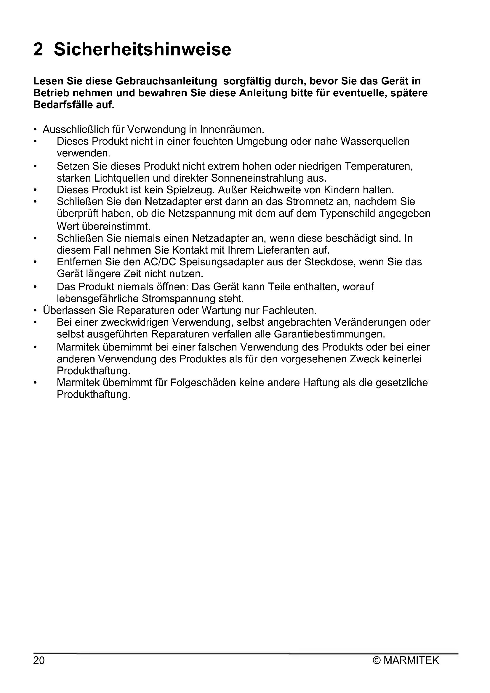 - Marmitek übernimmt bei einer falschen Verwendung des Produkts oder bei einer anderen Verwendung des Produktes als für den vorgesehenen Zweck keinerlei Produkthaftung.