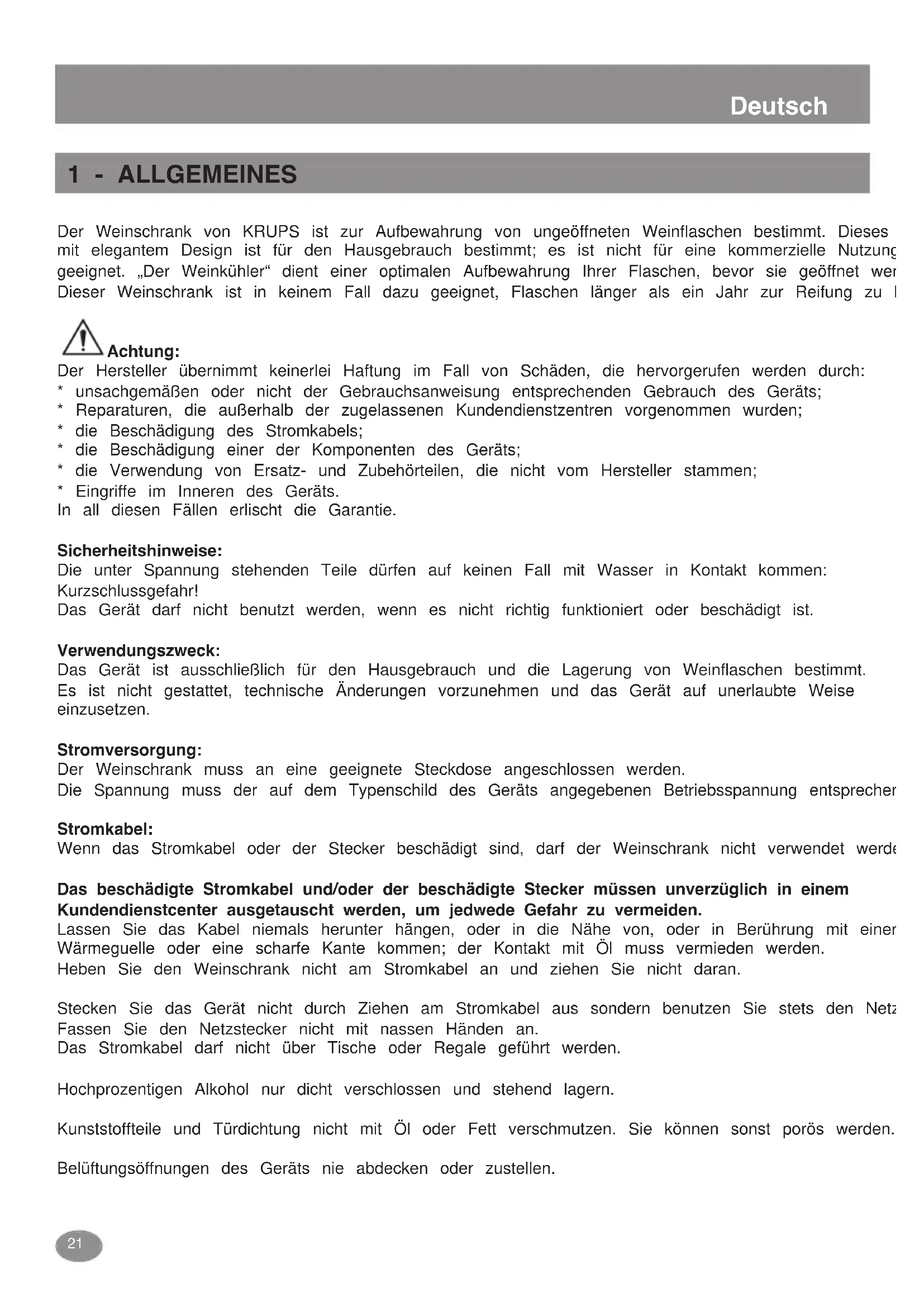 - Leave at least 10 to 15 cm of space free on all sides of the appliance. If you have any product problems or queries, please contact our Customer Relations Teams first for expert help and advice: HELPLINE: 0845 602 1454 – UK (01) 677 4003 - Ireland or consult our website – www.krups.co.uk Cavea?vins.qxd:KM8005franc$ais-copie.qxd20/02/0915:43Page20Deutsch Der Weinschrank von KRUPS ist zur Aufbewahrung von ungeöffneten Weinflaschen bestimmt. Dieses Gerät mit elegantem Design ist für den Hausgebrauch bestimmt; es ist nicht für eine kommerzielle Nutzung geeignet. „Der Weinkühler“ dient einer optimalen Aufbewahrung Ihrer Flaschen, bevor sie geöffnet werden. Dieser Weinschrank ist in keinem Fall dazu geeignet, Flaschen länger als ein Jahr zur Reifung zu lagern. Achtung: Der Hersteller übernimmt keinerlei Haftung im Fall von Schäden, die hervorgerufen werden durch: