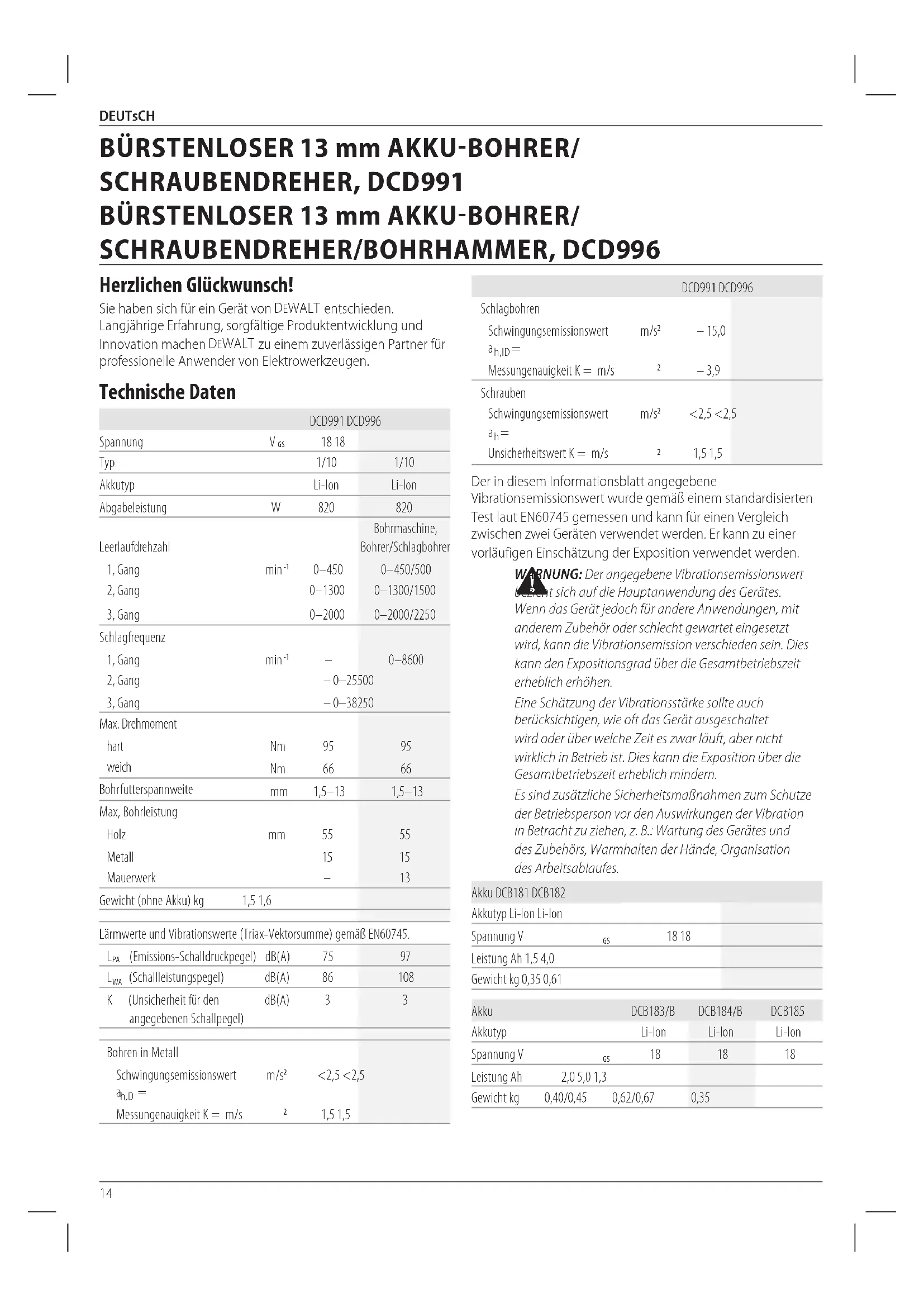Leistung Ah 2,0 5,0 1,3 Gewicht kg 0,40/0,45 0,62/0,67 0,35 Herzlichen Glückwunsch! Sie haben sich für ein Gerät von DeWALT entschieden. Langjährige Erfahrung, sorgfältige Produktentwicklung und Innovation machen DeWALT zu einem zuverlässigen Partner für professionelle Anwender vonElektrowerkzeugen. Technische Daten DCD991 DCD996 Spannung V