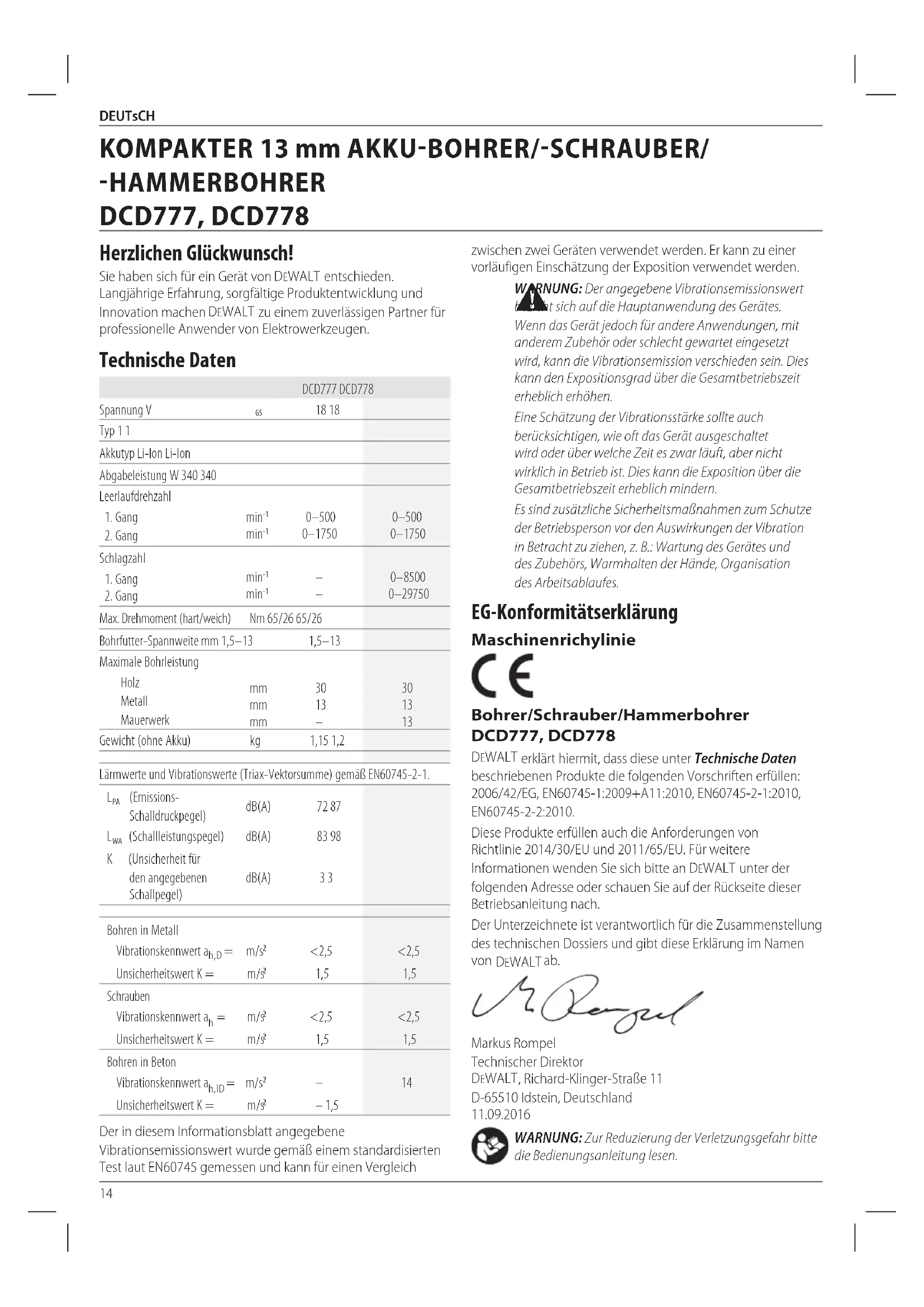 WARNUNG: Der angegebene Vibrationsemissionswert bezieht sich auf die Hauptanwendung des Gerätes. Wenn das Gerät jedoch für andere Anwendungen, mit anderem Zubehör oder schlecht gewartet eingesetzt wird, kann die Vibrationsemission verschieden sein. Dies kann den Expositionsgrad über die Gesamtbetriebszeit erheblicherhöhen. Eine Schätzung der Vibrationsstärke sollte auch berücksichtigen, wie oft das Gerät ausgeschaltet wird oder über welche Zeit es zwar läuft, aber nicht wirklich in Betrieb ist. Dies kann die Exposition über die Gesamtbetriebszeit erheblichmindern. Es sind zusätzliche Sicherheitsmaßnahmen zum Schutze der Betriebsperson vor den Auswirkungen der Vibration in Betracht zu ziehen, z.B.: Wartung des Gerätes und des Zubehörs, Warmhalten der Hände, Organisation desArbeitsablaufes. EG-Konformitätserklärung Maschinenrichylinie Bohrer/Schrauber/Hammerbohrer DCD777, DCD778 DeWALT erklärt hiermit, dass diese unter Technische Daten beschriebenen Produkte die folgenden Vorschriften erfüllen: 2006/42/EG, EN60745-1:2009+A11:2010, EN60745-2-1:2010, EN60745-2-2:2010. Diese Produkte erfüllen auch die Anforderungen von Richtlinie 2014/30/EU und 2011/65/EU. Für weitere Informationen wenden Sie sich bitte an DeWALT unter der folgenden Adresse oder schauen Sie auf der Rückseite dieser Betriebsanleitungnach. Der Unterzeichnete ist verantwortlich für die Zusammenstellung des technischen Dossiers und gibt diese Erklärung im Namen von DeWALT ab. Markus Rompel Technischer Direktor DeWALT , Richard-Klinger-Straße 11 D-65510 Idstein, Deutschland