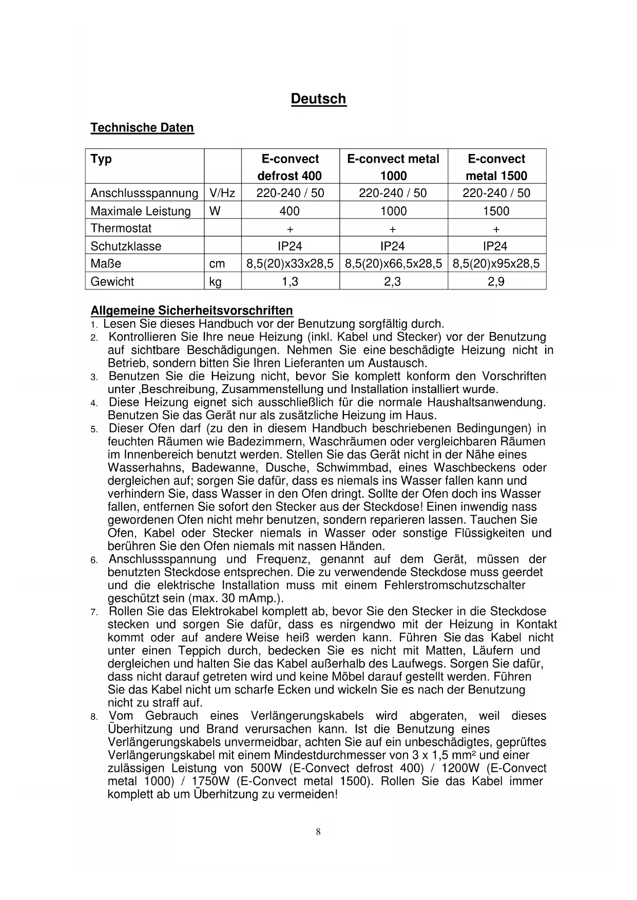 Überhitzung und Brand verursachen kann. Ist die Benutzung eines Verlängerungskabels unvermeidbar, achten Sie auf ein unbeschädigtes, geprüftes Verlängerungskabel mit einem Mindestdurchmesser von 3 x 1,5 mm² und einer zulässigen Leistung von 500W (E-Convect defrost 400) / 1200W (E-Convect metal 1000) / 1750W (E-Convect metal 1500). Rollen Sie das Kabel immer komplett ab um Überhitzung zu vermeiden!9