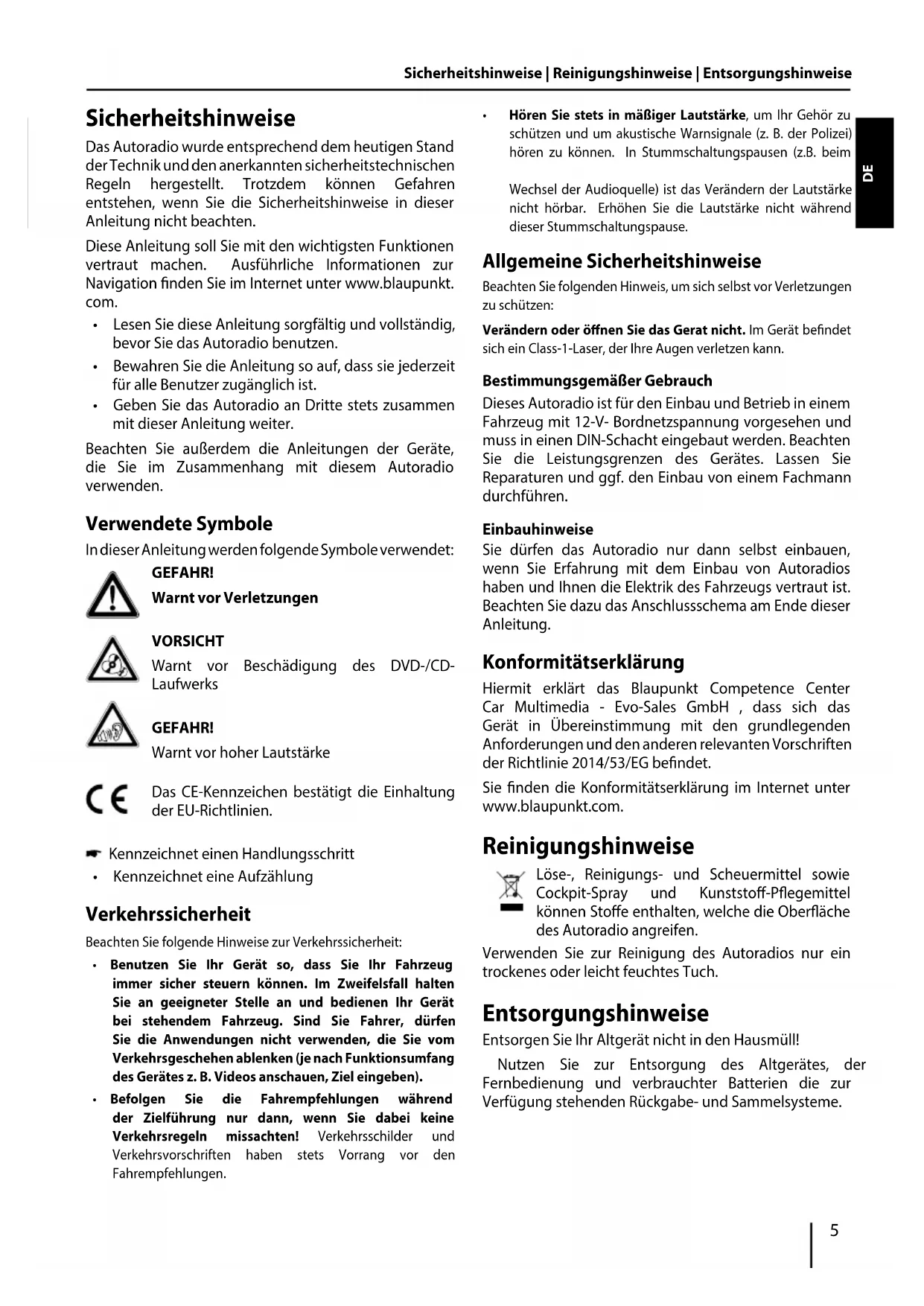 Wechsel der Audioquelle) ist das Verändern der Lautstärke nicht hörbar. Erhöhen Sie die Lautstärke nicht während dieser Stummschaltungspause. Allgemeine Sicherheitshinweise Beachten Sie folgenden Hinweis, um sich selbst vor Verletzungen zu schützen:Verändern oder önen Sie das Gerat nicht. Im Gerät bendet sich ein Class-1-Laser, der Ihre Augen verletzen kann. Bestimmungsgemäßer Gebrauch Dieses Autoradio ist für den Einbau und Betrieb in einem Fahrzeug mit 12-V- Bordnetzspannung vorgesehen und muss in einen DIN-Schacht eingebaut werden. Beachten Sie die Leistungsgrenzen des Gerätes. Lassen Sie Reparaturen und ggf. den Einbau von einem Fachmann durchführen. Einbauhinweise Sie dürfen das Autoradio nur dann selbst einbauen, wenn Sie Erfahrung mit dem Einbau von Autoradios haben und Ihnen die Elektrik des Fahrzeugs vertraut ist. Beachten Sie dazu das Anschlussschema am Ende dieser Anleitung. Konformitätserklärung Hiermit erklärt das Blaupunkt Competence Center Car Multimedia - Evo-Sales GmbH , dass sich das Gerät in Übereinstimmung mit den grundlegenden Anforderungen und den anderen relevanten Vorschriften der Richtlinie 2014/53/EG bendet. Sie nden die Konformitätserklärung im Internet unter www.blaupunkt.com. Reinigungshinweise Löse-, Reinigungs- und Scheuermittel sowie Cockpit-Spray und Kunststo-Pegemittel können Stoe enthalten, welche die Oberäche des Autoradio angreifen. Verwenden Sie zur Reinigung des Autoradios nur ein trockenes oder leicht feuchtes Tuch. Entsorgungshinweise Entsorgen Sie Ihr Altgerät nicht in den Hausmüll! Nutzen Sie zur Entsorgung des Altgerätes, der Fernbedienung und verbrauchter Batterien die zur Verfügung stehenden Rückgabe- und Sammelsysteme. DE6 Warnung Die Batterie nicht einnehmen, Chemische Gefahr (Die Fernbedienung im Lieferumfang) Dieses Produkt enthält eine Münzbatterie / Knopfzellenbatterie. Wenn die Münzbatterie / Knopfzellenbatterie verschluckt wird, kann dies innerhalb von nur 2 Stunden schwere innere Verbrennungen verursachen und zum Tod führen. Halten Sie neue und gebrauchte Batterien von Kindern fern. Wenn sich das Batteriefach nicht sicher schließen lässt, stellen Sie die Verwendung des Produkts ein und halten Sie es von Kindern fern. Wenn Sie denken, dass Batterien verschluckt oder in einen Körperteil eingelegt wurden, suchen Sie sofort einen Arzt auf. Lieferumfang Im Lieferumfang enthalten sind: