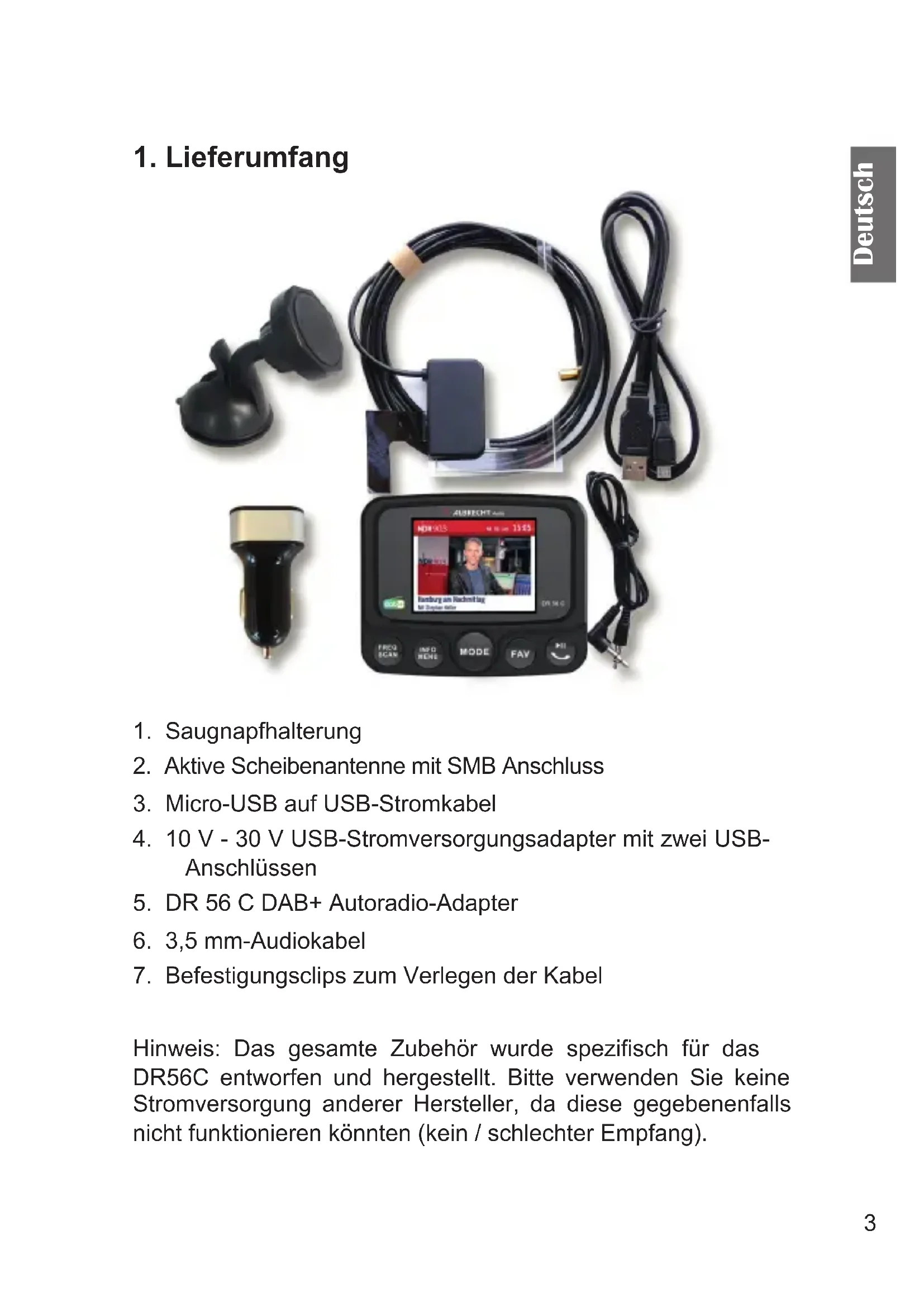 Hinweis: Das gesamte Zubehör wurde spezisch für das DR56C entworfen und hergestellt. Bitte verwenden Sie keine Stromversorgung anderer Hersteller, da diese gegebenenfalls nicht funktionieren könnten (kein / schlechter Empfang).4 Deutsch