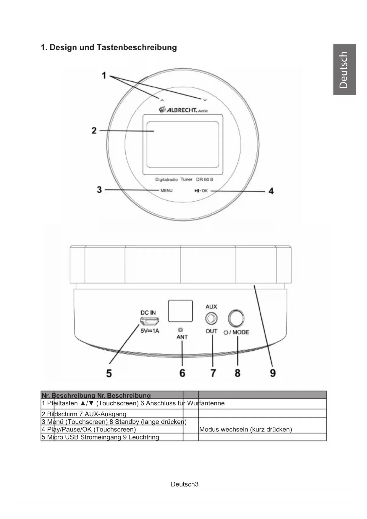 Nr. Beschreibung Nr. Beschreibung 1 Pfeiltasten ▲/▼ (Touchscreen) 6 Anschluss für Wurfantenne 2 Bildschirm 7 AUX-Ausgang 3 Menü (Touchscreen) 8 Standby (lange drücken) Modus wechseln (kurz drücken) 4 Play/Pause/OK (Touchscreen) 5 Micro USB Stromeingang 9 LeuchtringDeutsch Deutsch4 1.1. Fernbedienung Taste Funktionen Ein-/Ausschalten (Standby) MODE Modus wechseln: DAB+ / UKW / Bluetooth Favoritenliste öffnen / Favoriten speichern Wecker Einstellungen Stummschaltung (Mute) Steuerkreuz
