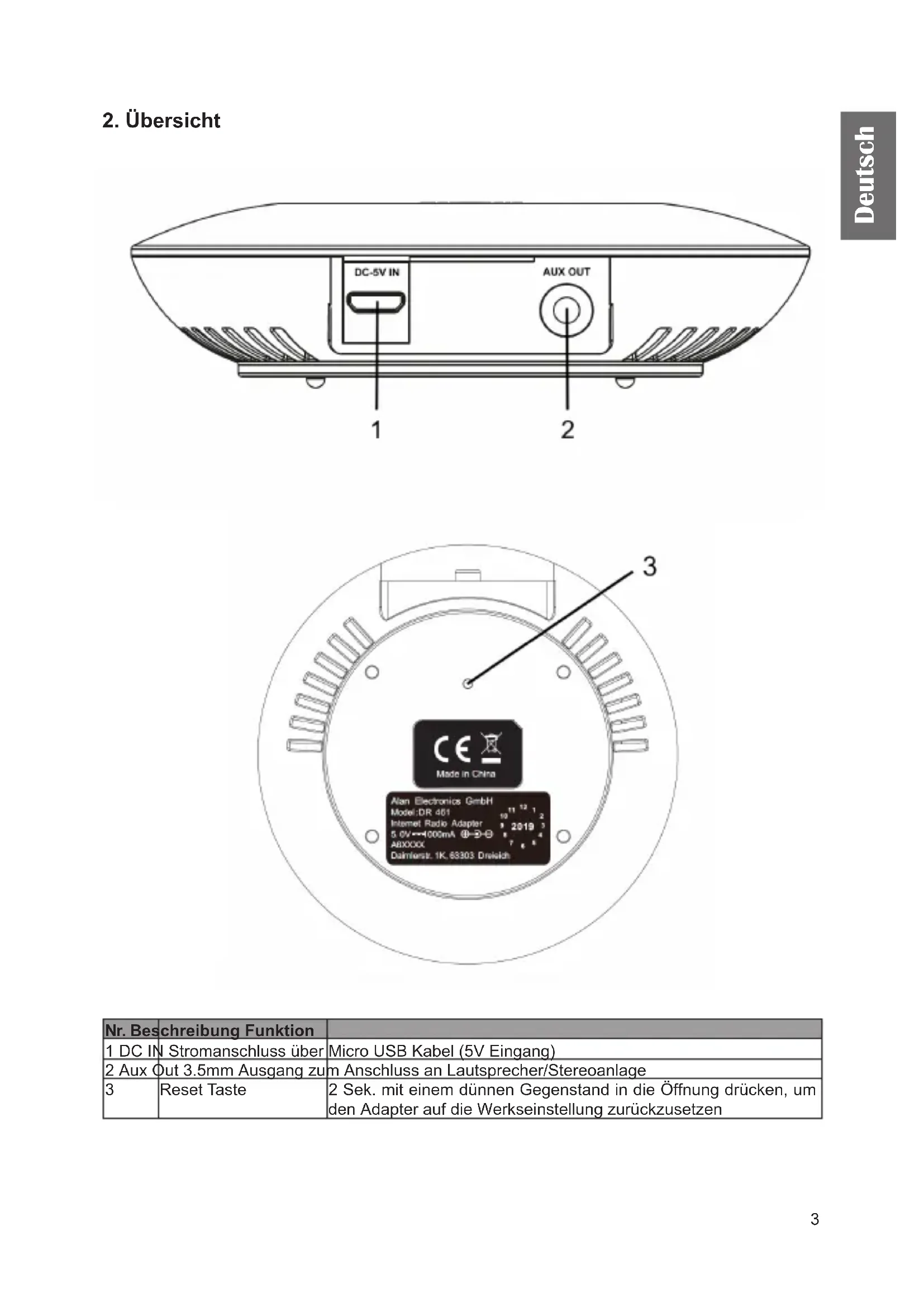 Nr. Beschreibung Funktion 1 DC IN Stromanschluss über Micro USB Kabel (5V Eingang) 2 Aux Out 3.5mm Ausgang zum Anschluss an Lautsprecher/Stereoanlage 3 Reset Taste 2 Sek. mit einem dünnen Gegenstand in die Öffnung drücken, um den Adapter auf die Werkseinstellung zurückzusetzen4 Deutsch