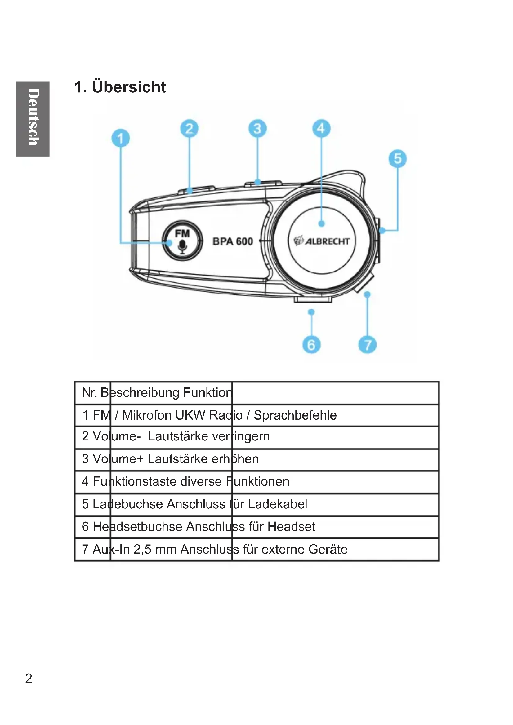 Nr. Beschreibung Funktion 1 FM / Mikrofon UKW Radio / Sprachbefehle 2 Volume- Lautstärke verringern 3 Volume+ Lautstärke erhöhen 4 Funktionstaste diverse Funktionen 5 Ladebuchse Anschluss für Ladekabel 6 Headsetbuchse Anschluss für Headset 7 Aux-In 2,5 mm Anschluss für externe Geräte3 Deutsch