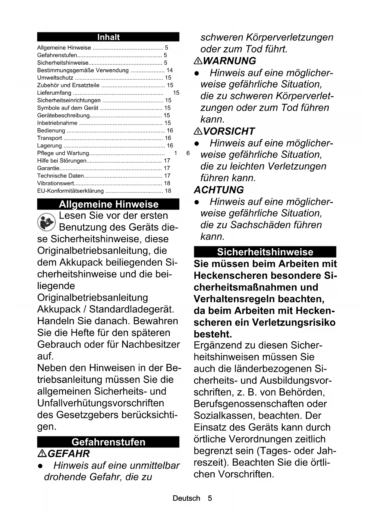 - 381AB C D E F G H IJDeutsch 5 Inhalt Allgemeine Hinweise Lesen Sie vor der ersten Benutzung des Geräts die- se Sicherheitshinweise, diese Originalbetriebsanleitung, die dem Akkupack beiliegenden Si- cherheitshinweise und die bei- liegende Originalbetriebsanleitung Akkupack / Standardladegerät. Handeln Sie danach. Bewahren Sie die Hefte für den späteren Gebrauch oder für Nachbesitzer auf. Neben den Hinweisen in der Be- triebsanleitung müssen Sie die allgemeinen Sicherheits- und Unfallverhütungsvorschriften des Gesetzgebers berücksichti- gen. Gefahrenstufen GEFAHR ● Hinweis auf eine unmittelbar drohende Gefahr, die zu schweren Körperverletzungen oder zum Tod führt. 몇 WARNUNG ● Hinweis auf eine möglicher- weise gefährliche Situation, die zu schweren Körperverlet- zungen oder zum Tod führen kann. 몇 VORSICHT ● Hinweis auf eine möglicher- weise gefährliche Situation, die zu leichten Verletzungen führen kann. ACHTUNG ● Hinweis auf eine möglicher- weise gefährliche Situation, die zu Sachschäden führen kann. Sicherheitshinweise Sie müssen beim Arbeiten mit Heckenscheren besondere Si- cherheitsmaßnahmen und Verhaltensregeln beachten, da beim Arbeiten mit Hecken- scheren ein Verletzungsrisiko besteht. Ergänzend zu diesen Sicher- heitshinweisen müssen Sie auch die länderbezogenen Si- cherheits- und Ausbildungsvor- schriften, z. B. von Behörden, Berufsgenossenschaften oder Sozialkassen, beachten. Der Einsatz des Geräts kann durch örtliche Verordnungen zeitlich begrenzt sein (Tages- oder Jah- reszeit). Beachten Sie die örtli- chen Vorschriften. Allgemeine Hinweise p. 5