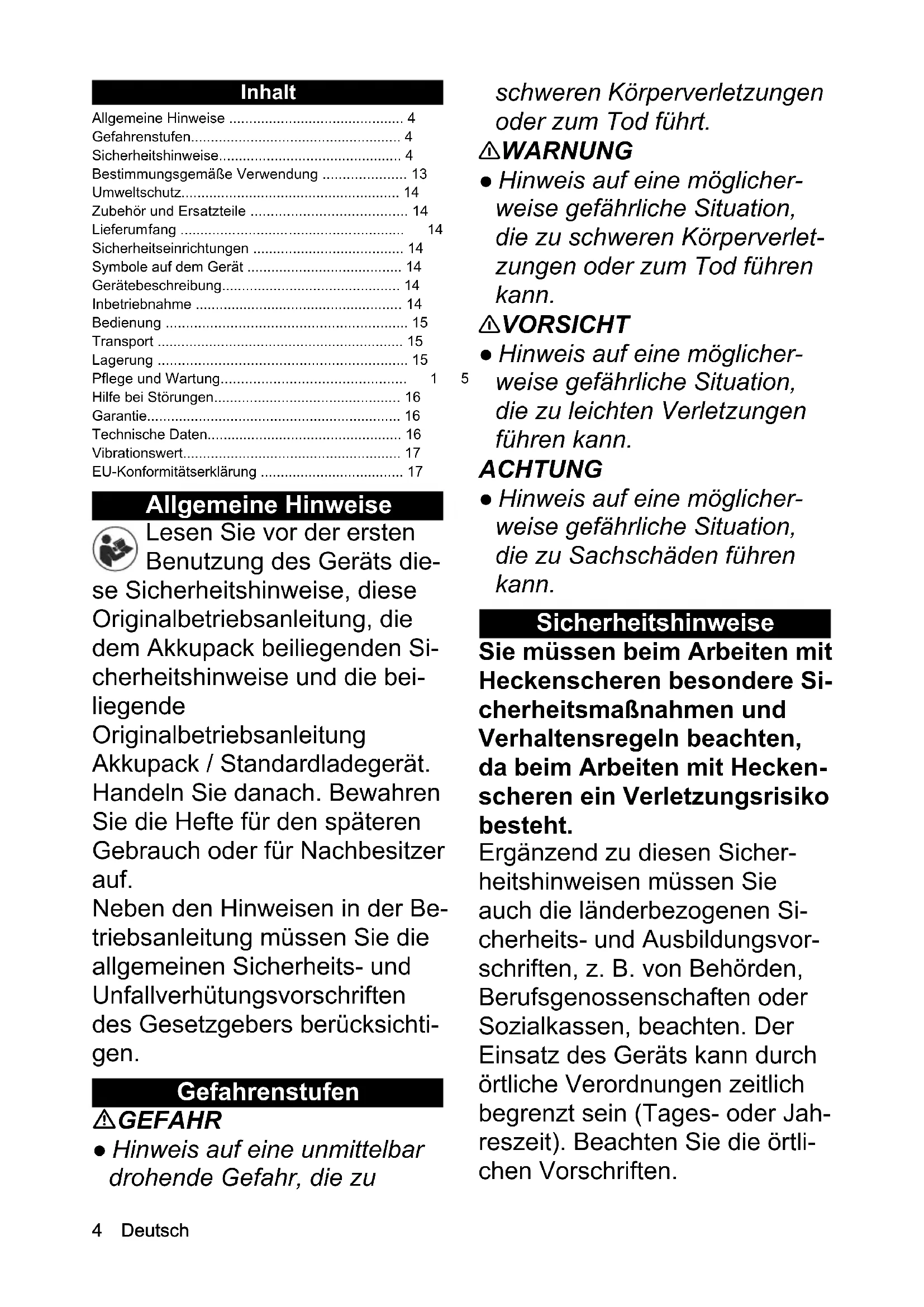 - F G H4 Deutsch Inhalt Allgemeine Hinweise Lesen Sie vor der ersten Benutzung des Geräts die- se Sicherheitshinweise, diese Originalbetriebsanleitung, die dem Akkupack beiliegenden Si- cherheitshinweise und die bei- liegende Originalbetriebsanleitung Akkupack / Standardladegerät. Handeln Sie danach. Bewahren Sie die Hefte für den späteren Gebrauch oder für Nachbesitzer auf. Neben den Hinweisen in der Be- triebsanleitung müssen Sie die allgemeinen Sicherheits- und Unfallverhütungsvorschriften des Gesetzgebers berücksichti- gen. Gefahrenstufen GEFAHR ● Hinweis auf eine unmittelbar drohende Gefahr, die zu schweren Körperverletzungen oder zum Tod führt. 몇 WARNUNG ● Hinweis auf eine möglicher- weise gefährliche Situation, die zu schweren Körperverlet- zungen oder zum Tod führen kann. 몇 VORSICHT ● Hinweis auf eine möglicher- weise gefährliche Situation, die zu leichten Verletzungen führen kann. ACHTUNG ● Hinweis auf eine möglicher- weise gefährliche Situation, die zu Sachschäden führen kann. Sicherheitshinweise Sie müssen beim Arbeiten mit Heckenscheren besondere Si- cherheitsmaßnahmen und Verhaltensregeln beachten, da beim Arbeiten mit Hecken- scheren ein Verletzungsrisiko besteht. Ergänzend zu diesen Sicher- heitshinweisen müssen Sie auch die länderbezogenen Si- cherheits- und Ausbildungsvor- schriften, z. B. von Behörden, Berufsgenossenschaften oder Sozialkassen, beachten. Der Einsatz des Geräts kann durch örtliche Verordnungen zeitlich begrenzt sein (Tages- oder Jah- reszeit). Beachten Sie die örtli- chen Vorschriften. Allgemeine Hinweise p. 4
