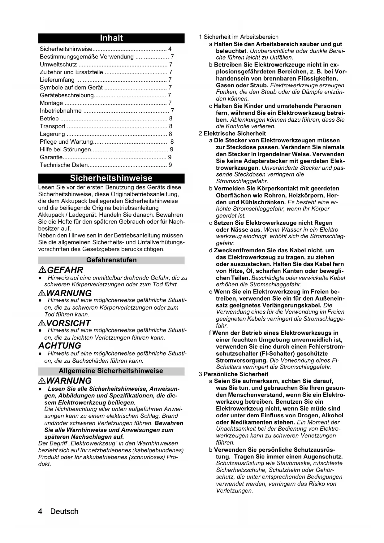 156A 2B C D E F G H I 34 Deutsch Inhalt Sicherheitshinweise Lesen Sie vor der ersten Benutzung des Geräts diese Sicherheitshinweise, diese Originalbetriebsanleitung, die dem Akkupack beiliegenden Sicherheitshinweise und die beiliegende Originalbetriebsanleitung Akkupack / Ladegerät. Handeln Sie danach. Bewahren Sie die Hefte für den späteren Gebrauch oder für Nach- besitzer auf. Neben den Hinweisen in der Betriebsanleitung müssen Sie die allgemeinen Sicherheits- und Unfallverhütungs- vorschriften des Gesetzgebers berücksichtigen. Gefahrenstufen GEFAHR ● Hinweis auf eine unmittelbar drohende Gefahr, die zu schweren Körperverletzungen oder zum Tod führt. 몇 WARNUNG ● Hinweis auf eine möglicherweise gefährliche Situati- on, die zu schweren Körperverletzungen oder zum
