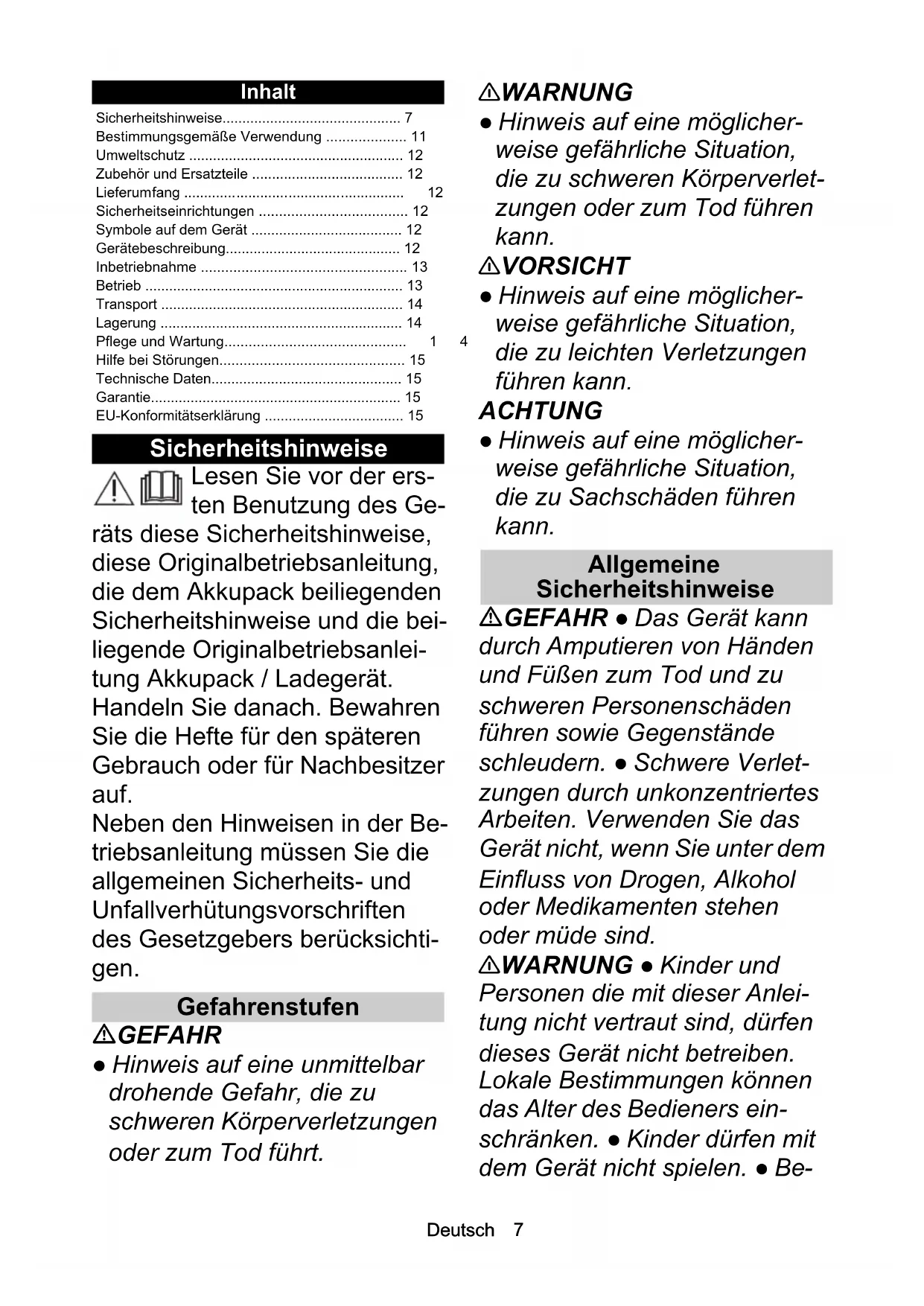 • T U V W X YZ AA AB ACDeutsch 7 Inhalt Sicherheitshinweise Lesen Sie vor der ers- ten Benutzung des Ge- räts diese Sicherheitshinweise, diese Originalbetriebsanleitung, die dem Akkupack beiliegenden Sicherheitshinweise und die bei- liegende Originalbetriebsanlei- tung Akkupack / Ladegerät. Handeln Sie danach. Bewahren Sie die Hefte für den späteren Gebrauch oder für Nachbesitzer auf. Neben den Hinweisen in der Be- triebsanleitung müssen Sie die allgemeinen Sicherheits- und Unfallverhütungsvorschriften des Gesetzgebers berücksichti- gen. Gefahrenstufen GEFAHR ● Hinweis auf eine unmittelbar drohende Gefahr, die zu schweren Körperverletzungen oder zum Tod führt. 몇 WARNUNG ● Hinweis auf eine möglicher- weise gefährliche Situation, die zu schweren Körperverlet- zungen oder zum Tod führen kann. 몇 VORSICHT ● Hinweis auf eine möglicher- weise gefährliche Situation, die zu leichten Verletzungen führen kann. ACHTUNG ● Hinweis auf eine möglicher- weise gefährliche Situation, die zu Sachschäden führen kann. Allgemeine Sicherheitshinweise GEFAHR ● Das Gerät kann durch Amputieren von Händen und Füßen zum Tod und zu schweren Personenschäden führen sowie Gegenstände schleudern. ● Schwere Verlet- zungen durch unkonzentriertes Arbeiten. Verwenden Sie das Gerät nicht, wenn Sie unter dem Einfluss von Drogen, Alkohol oder Medikamenten stehen oder müde sind. 몇 WARNUNG ● Kinder und Personen die mit dieser Anlei- tung nicht vertraut sind, dürfen dieses Gerät nicht betreiben. Lokale Bestimmungen können das Alter des Bedieners ein- schränken. ● Kinder dürfen mit dem Gerät nicht spielen. ● Be- Sicherheitshinweise p. 7