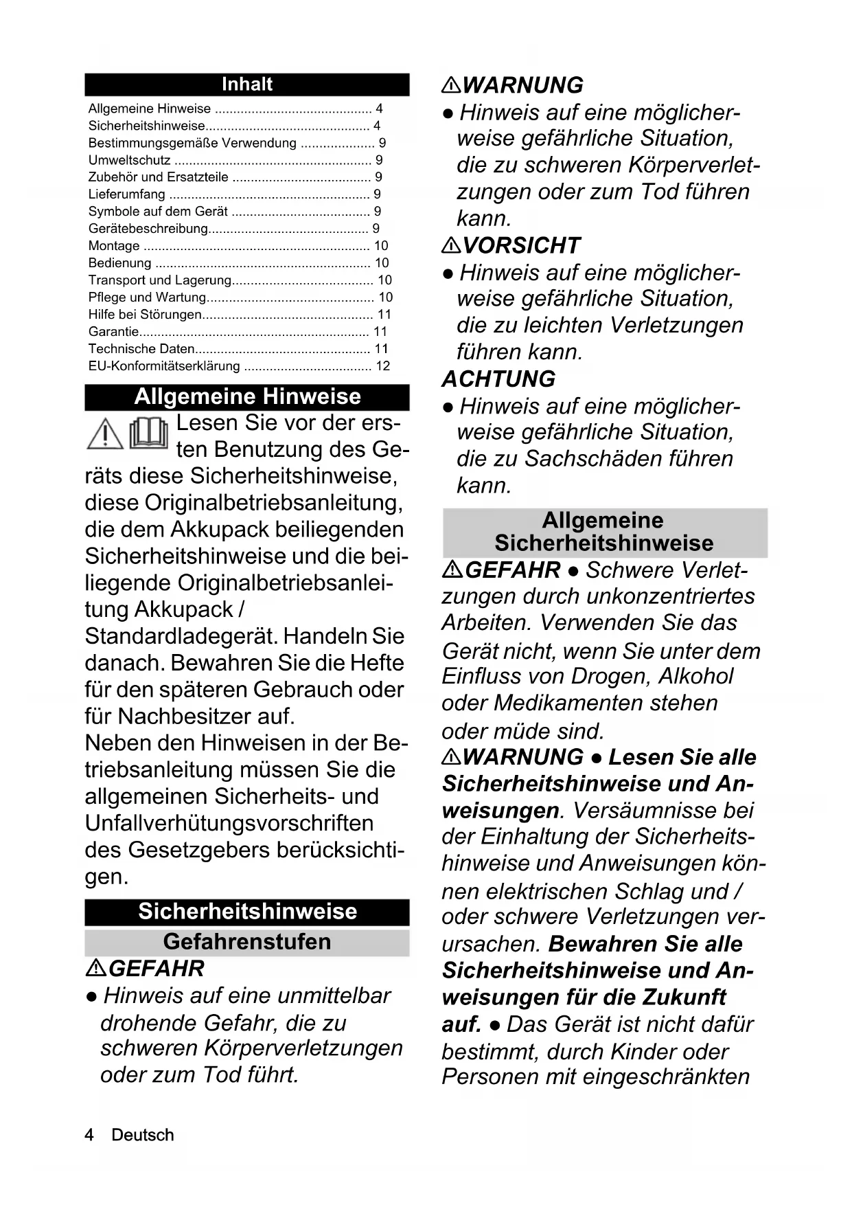 - H I4 Deutsch Inhalt Allgemeine Hinweise Lesen Sie vor der ers- ten Benutzung des Ge- räts diese Sicherheitshinweise, diese Originalbetriebsanleitung, die dem Akkupack beiliegenden Sicherheitshinweise und die bei- liegende Originalbetriebsanlei- tung Akkupack / Standardladegerät. Handeln Sie danach. Bewahren Sie die Hefte für den späteren Gebrauch oder für Nachbesitzer auf. Neben den Hinweisen in der Be- triebsanleitung müssen Sie die allgemeinen Sicherheits- und Unfallverhütungsvorschriften des Gesetzgebers berücksichti- gen. Sicherheitshinweise Gefahrenstufen GEFAHR ● Hinweis auf eine unmittelbar drohende Gefahr, die zu schweren Körperverletzungen oder zum Tod führt. 몇 WARNUNG ● Hinweis auf eine möglicher- weise gefährliche Situation, die zu schweren Körperverlet- zungen oder zum Tod führen kann. 몇 VORSICHT ● Hinweis auf eine möglicher- weise gefährliche Situation, die zu leichten Verletzungen führen kann. ACHTUNG ● Hinweis auf eine möglicher- weise gefährliche Situation, die zu Sachschäden führen kann. Allgemeine Sicherheitshinweise GEFAHR ● Schwere Verlet- zungen durch unkonzentriertes Arbeiten. Verwenden Sie das Gerät nicht, wenn Sie unter dem Einfluss von Drogen, Alkohol oder Medikamenten stehen oder müde sind. 몇 WARNUNG ● Lesen Sie alle Sicherheitshinweise und An- weisungen. Versäumnisse bei der Einhaltung der Sicherheits- hinweise und Anweisungen kön- nen elektrischen Schlag und / oder schwere Verletzungen ver- ursachen. Bewahren Sie alle Sicherheitshinweise und An- weisungen für die Zukunft auf. ● Das Gerät ist nicht dafür bestimmt, durch Kinder oder Personen mit eingeschränkten Allgemeine Hinweise p. 4