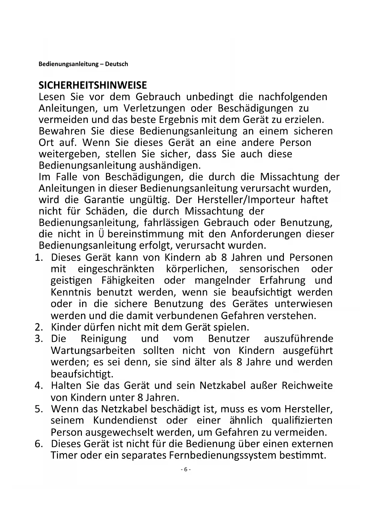 1. Dieses Gerät ist nur für den Heimgebrauch bestimmt.