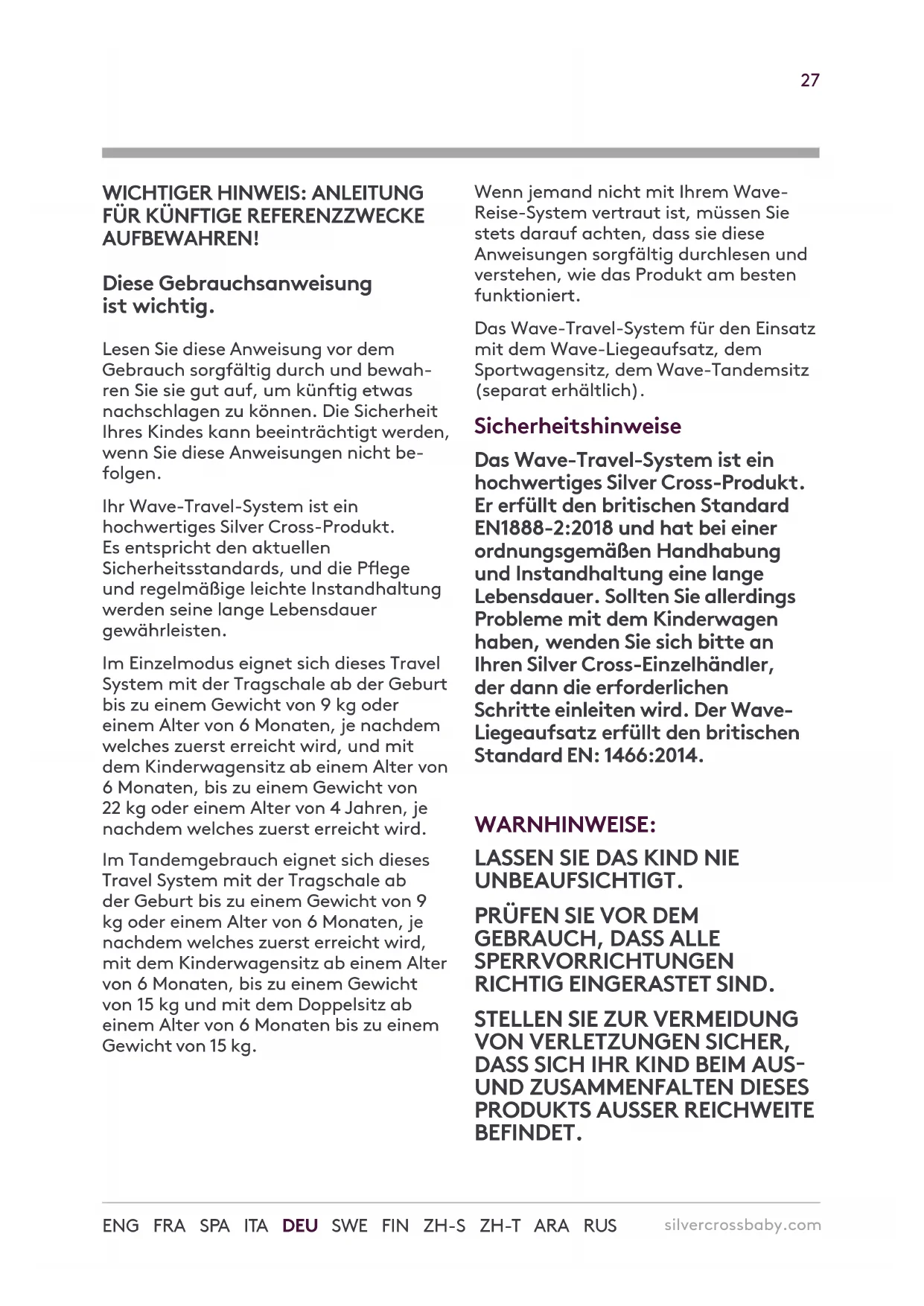AUFBEWAHREN! Diese Gebrauchsanweisung istwichtig. Lesen Sie diese Anweisung vor dem Gebrauch sorgfältig durch und bewah- ren Sie sie gut auf, um künftig etwas nachschlagen zu können. Die Sicherheit Ihres Kindes kann beeinträchtigt werden, wenn Sie diese Anweisungen nicht be- folgen. Ihr Wave-Travel-System ist ein hochwertiges Silver Cross-Produkt. Es entspricht den aktuellen Sicherheitsstandards, und die Pege und regelmäßige leichte Instandhaltung werden seine lange Lebensdauer gewährleisten. Im Einzelmodus eignet sich dieses Travel System mit der Tragschale ab der Geburt bis zu einem Gewicht von 9 kg oder einem Alter von 6 Monaten, je nachdem welches zuerst erreicht wird, und mit dem Kinderwagensitz ab einem Alter von 6 Monaten, bis zu einem Gewicht von 22 kg oder einem Alter von 4 Jahren, je nachdem welches zuerst erreicht wird. Im Tandemgebrauch eignet sich dieses Travel System mit der Tragschale ab der Geburt bis zu einem Gewicht von 9 kg oder einem Alter von 6 Monaten, je nachdem welches zuerst erreicht wird, mit dem Kinderwagensitz ab einem Alter von 6 Monaten, bis zu einem Gewicht von 15 kg und mit dem Doppelsitz ab einem Alter von 6 Monaten bis zu einem Gewicht von 15 kg. Wenn jemand nicht mit Ihrem Wave- Reise-System vertraut ist, müssen Sie stets darauf achten, dass sie diese Anweisungen sorgfältig durchlesen und verstehen, wie das Produkt am besten funktioniert. Das Wave-Travel-System für den Einsatz mit dem Wave-Liegeaufsatz, dem Sportwagensitz, dem Wave-Tandemsitz (separat erhältlich). Sicherheitshinweise Das Wave-Travel-System ist ein hochwertiges Silver Cross-Produkt. Er erfüllt den britischen Standard EN1888-2:2018 und hat bei einer ordnungsgemäßen Handhabung und Instandhaltung eine lange Lebensdauer. Sollten Sie allerdings Probleme mit dem Kinderwagen haben, wenden Sie sich bitte an Ihren Silver Cross-Einzelhändler, der dann die erforderlichen Schritte einleiten wird. Der Wave- Liegeaufsatz erfüllt den britischen Standard EN: 1466:2014. WARNHINWEISE: