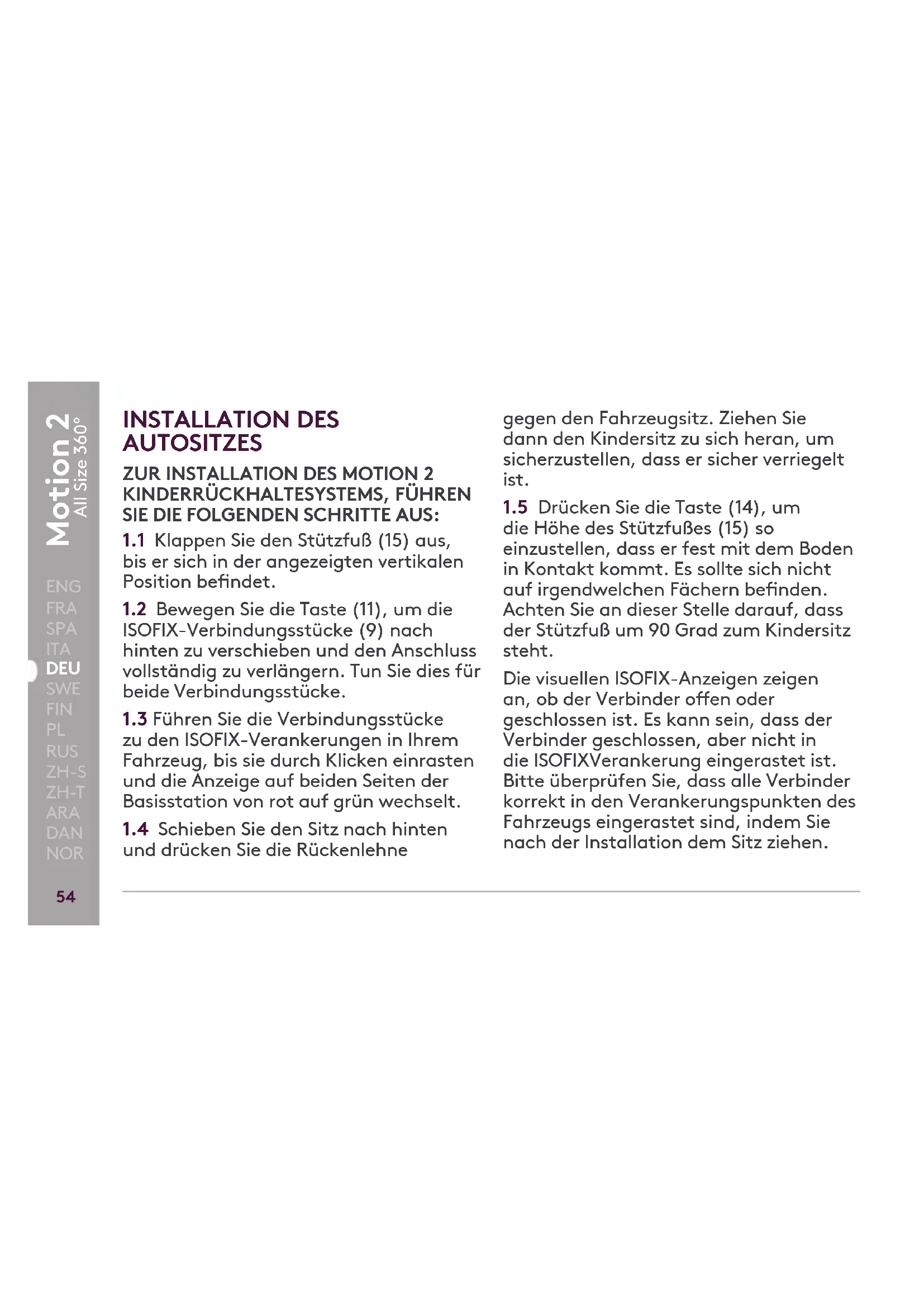 die Höhe des Stützfußes (15) so einzustellen, dass er fest mit dem Boden in Kontakt kommt. Es sollte sich nicht auf irgendwelchen Fächern benden. Achten Sie an dieser Stelle darauf, dass der Stützfuß um 90 Grad zum Kindersitz steht. Die visuellen ISOFIX-Anzeigen zeigen an, ob der Verbinder oen oder geschlossen ist. Es kann sein, dass der Verbinder geschlossen, aber nicht in die ISOFIXVerankerung eingerastet ist. Bitte überprüfen Sie, dass alle Verbinder korrekt in den Verankerungspunkten des Fahrzeugs eingerastet sind, indem Sie nach der Installation dem Sitz ziehen. Motion 2 All Size 360ºsilvercrossbaby.com ZUM LÖSEN DES SITZES FÜHREN SIE DIE