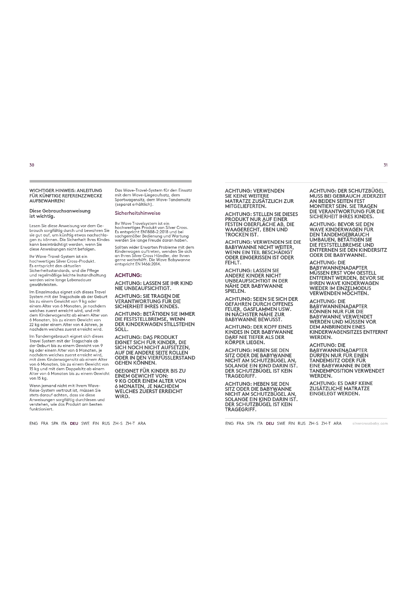AUFBEWAHREN! Diese Gebrauchsanweisung istwichtig. Lesen Sie diese Anweisung vor dem Ge- brauch sorgfältig durch und bewahren Sie sie gut auf, um künftig etwas nachschla- gen zu können. Die Sicherheit Ihres Kindes kann beeinträchtigt werden, wenn Sie diese Anweisungen nicht befolgen. Ihr Wave-Travel-System ist ein hochwertiges Silver Cross-Produkt. Es entspricht den aktuellen Sicherheitsstandards, und die Pege und regelmäßige leichte Instandhaltung werden seine lange Lebensdauer gewährleisten. Im Einzelmodus eignet sich dieses Travel System mit der Tragschale ab der Geburt bis zu einem Gewicht von 9 kg oder einem Alter von 6 Monaten, je nachdem welches zuerst erreicht wird, und mit dem Kinderwagensitz ab einem Alter von 6 Monaten, bis zu einem Gewicht von 22 kg oder einem Alter von 4 Jahren, je nachdem welches zuerst erreicht wird. Im Tandemgebrauch eignet sich dieses Travel System mit der Tragschale ab der Geburt bis zu einem Gewicht von 9 kg oder einem Alter von 6 Monaten, je nachdem welches zuerst erreicht wird, mit dem Kinderwagensitz ab einem Alter von 6 Monaten, bis zu einem Gewicht von 15 kg und mit dem Doppelsitz ab einem Alter von 6 Monaten bis zu einem Gewicht von 15 kg. Wenn jemand nicht mit Ihrem Wave- Reise-System vertraut ist, müssen Sie stets darauf achten, dass sie diese Anweisungen sorgfältig durchlesen und verstehen, wie das Produkt am besten funktioniert. Das Wave-Travel-System für den Einsatz mit dem Wave-Liegeaufsatz, dem Sportwagensitz, dem Wave-Tandemsitz (separat erhältlich). Sicherheitshinweise Ihr Wave Travelsystem ist ein hochwertiges Produkt von Silver Cross. Es entspricht EN1888-2:2018 und bei sachgemäßer Bedienung und Wartung werden Sie lange Freude daran haben. Sollten wider Erwarten Probleme mit dem Kinderwagen auftreten, wenden Sie sich an Ihren Silver Cross Händler, der Ihnen gerne weiterhilft. Die Wave Babywanne entspricht EN 1466:2014. ACHTUNG: