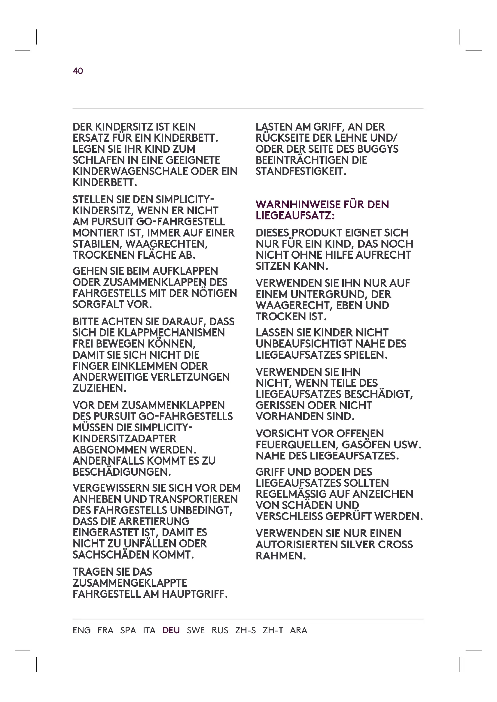 BORSA FASCIATOIO: 1 KG. Cura e manutenzione Telaio Vericare sempre che sul passeggino non siano presenti segni di usura. Lubricare regolarmente tutte le parti mobili. Vericare che i dispositivi di bloccaggio funzionino correttamente. Lucidare le parti in metallo con un panno pulito ed asciutto. Parti in tessuto e seduta Per le istruzioni di lavaggio dei tessuti, fare riferimento alla guida di cura in dotazione con il passeggino. Tenere lontano da fonti di calore e dalla luce solare. Con l’uso quotidiano, il tessuto può scolorire nel corso del tempo. Non lavare in lavatrice, non utilizzare l’asciugatrice, non stirare e non candeggiare. Non lasciare mai gli accessori, come l’ombrellino o il parapioggia, esposti al calore o alla luce, ad es. sulla cappelliera dell’auto durante la stagione calda, in quanto i tessuti potrebbero scolorire e/o la plastica potrebbe deformarsi. Garanzia Tutti i prodotti Silver Cross sono garantiti per un periodo di 36 mesi contro difetti di fabbricazione, purché il prodotto venga utilizzato correttamente, in conformità al manuale delle istruzioni. Leggere attentamente le istruzioni prima di utilizzare il nuovo passeggino Pursuit Go e conservarle per future consultazioni. www.silvercrossbaby.com38 Sicherheitshinweise Das Pursuit Go -Travel-System ist ein hochwertiges Silver Cross-Produkt. Er erfüllt den britischen Standard EN1888-1/2:2018 und hat bei einer ordnungsgemäßen Handhabung und Instandhaltung eine lange Lebensdauer. Sollten Sie allerdings Probleme mit dem Kinderwagen haben, wenden Sie sich bitte an Ihren Silver Cross-Einzelhändler, der dann die erforderlichen Schritte einleiten wird. Der Pursuit-Liegeaufsatz erfüllt den britischen Standard EN1466:2014. Das Pursuit Go-Fahrgestell ist auf den Sitz des Pursuit Go-Buggys, der Pursuit Go -Tragschale (separat erhältlich) und den Simplicity-Kindersitz (separat erhältlich) abgestimmt und wurde entsprechend getestet. Dieses Produkt ist für Kinder ab der Geburt und bis zu einem Gewicht von 9 kg für die Tragschale und bis zu 22 kg für den Sitz oder dem Alter von 4 Jahren, je nachdem welches zuerst erreicht wird, geeignet. Silver Cross empehlt, die Rückenlehne für sehr kleine Babys ganz herunterzuklappen. Vergewissern Sie sich, dass die Räder fest montiert sind, indem Sie sie behutsam vom Fahrgestell wegziehen. Wenn Sie die Feststellbremse betätigen, vergewissern Sie sich immer, dass sie ordnungsgemäß funktioniert, indem Sie das Fahrgestell behutsam vor- und zurückbewegen. WICHTIG: Nehmen Sie das Kind aus dem Buggy, bevor Sie den Buggy-Sitz vom Fahrgestell abnehmen. Bevor Sie das Pursuit Go-Fahrgestell zusammenklappen, leeren Sie den Ablagekorb, damit sich das Fahrgestell ordnungsgemäß zusammenklappen lässt Verwenden Sie ausschließlich von Silver Cross gelieferte/empfohlene Ersatzteile. DIESE GEBRAUCHSANWEISUNG ISTWICHTIG.