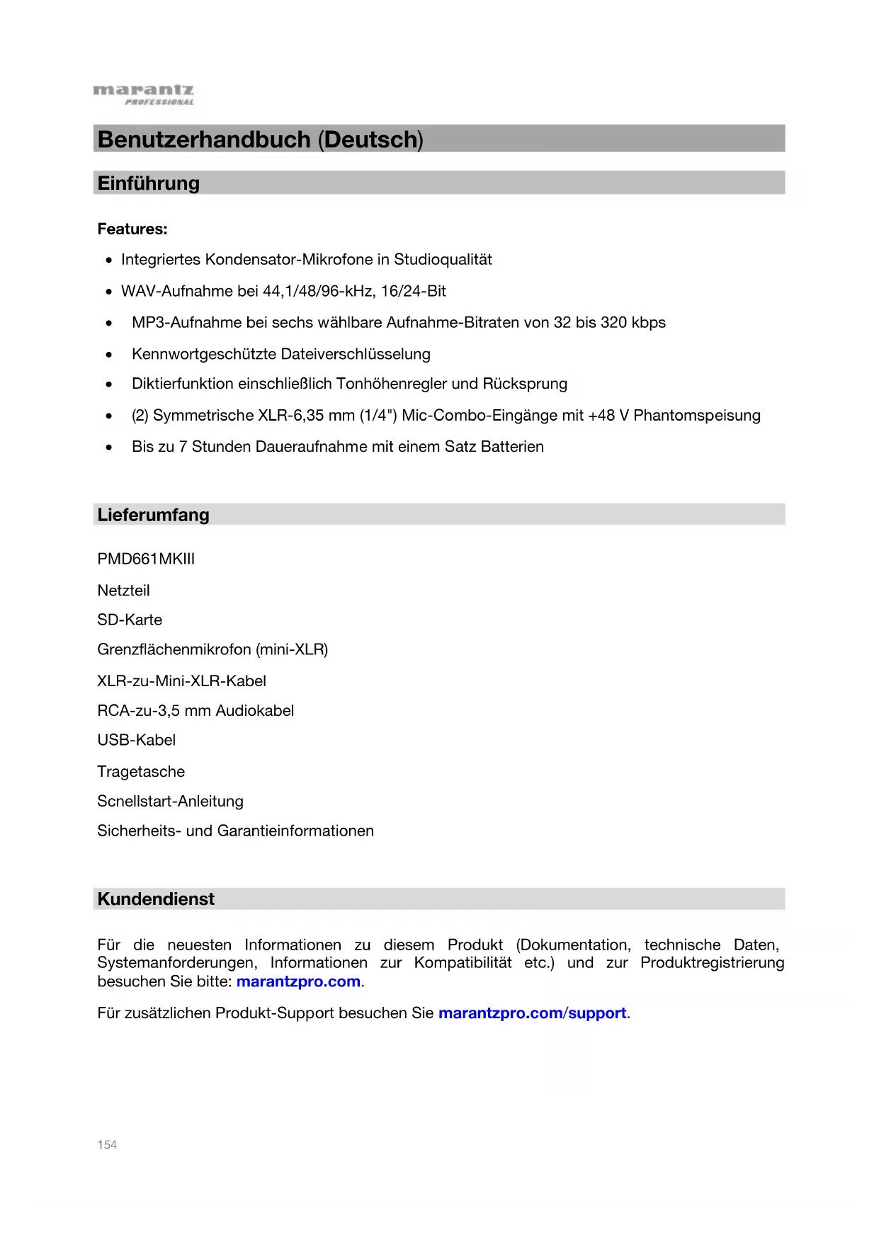 Kundendienst Für die neuesten Informationen zu diesem Produkt (Dokumentation, technische Daten, Systemanforderungen, Informationen zur Kompatibilität etc.) und zur Produktregistrierung besuchen Sie bitte: marantzpro.com. Für zusätzlichen Produkt-Support besuchen Sie marantzpro.com/support.155