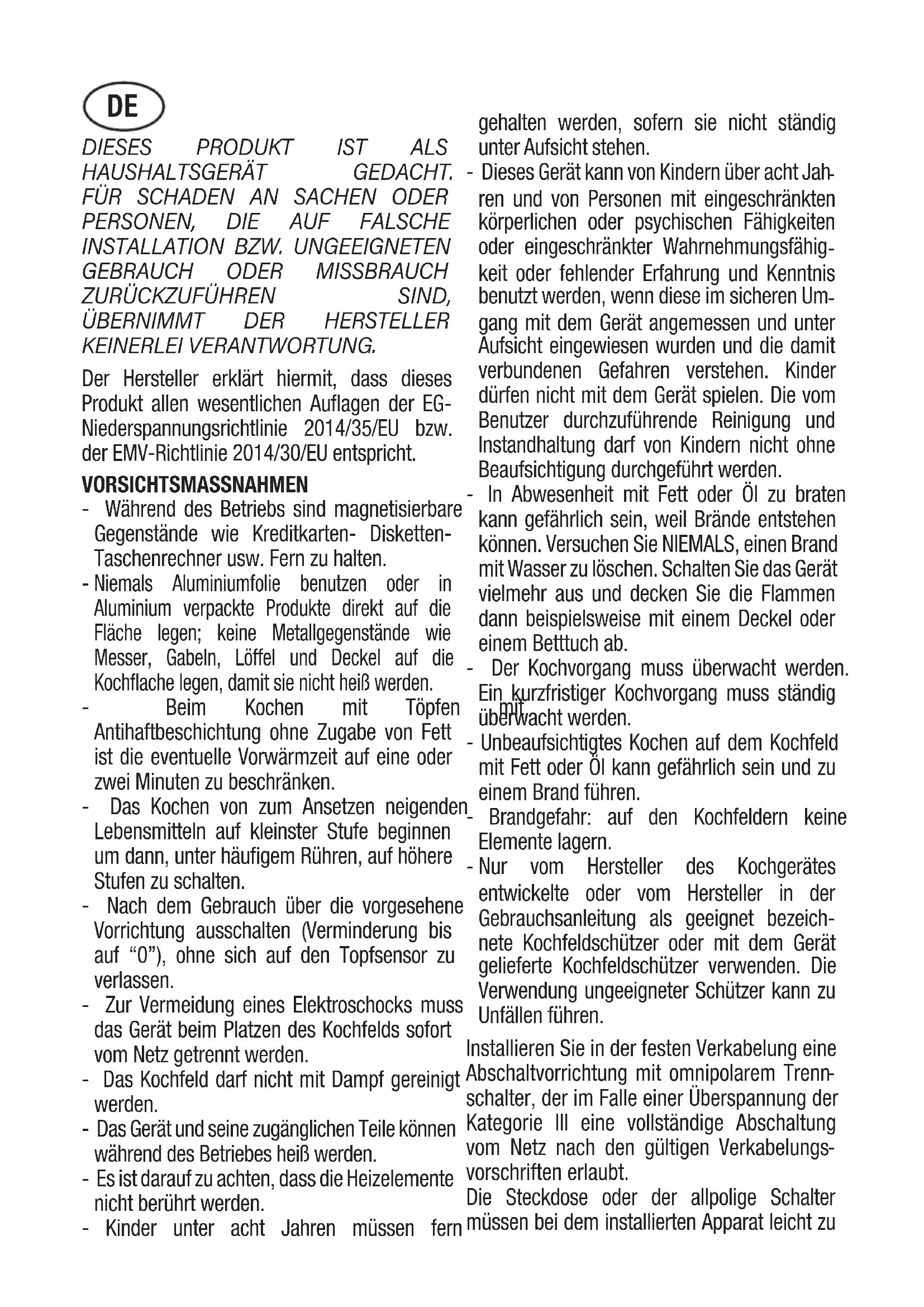 gang mit dem Gerät angemessen und unter Aufsicht eingewiesen wurden und die damit verbundenen Gefahren verstehen. Kinder dürfen nicht mit dem Gerät spielen. Die vom Benutzer durchzuführende Reinigung und Instandhaltung darf von Kindern nicht ohne Beaufsichtigung durchgeführt werden. - In Abwesenheit mit Fett oder Öl zu braten kann gefährlich sein, weil Brände entstehen können. Versuchen Sie NIEMALS, einen Brand mit Wasser zu löschen. Schalten Sie das Gerät vielmehr aus und decken Sie die Flammen dann beispielsweise mit einem Deckel oder einem Betttuch ab. - Der Kochvorgang muss überwacht werden. Ein kurzfristiger Kochvorgang muss ständig überwacht werden. - Unbeaufsichtigtes Kochen auf dem Kochfeld mit Fett oder Öl kann gefährlich sein und zu einem Brand führen. - Brandgefahr: auf den Kochfeldern keine Elemente lagern. - Nur vom Hersteller des Kochgerätes entwickelte oder vom Hersteller in der Gebrauchsanleitung als geeignet bezeich- nete Kochfeldschützer oder mit dem Gerät gelieferte Kochfeldschützer verwenden. Die Verwendung ungeeigneter Schützer kann zu Unfällen führen. Installieren Sie in der festen Verkabelung eine Abschaltvorrichtung mit omnipolarem Trenn