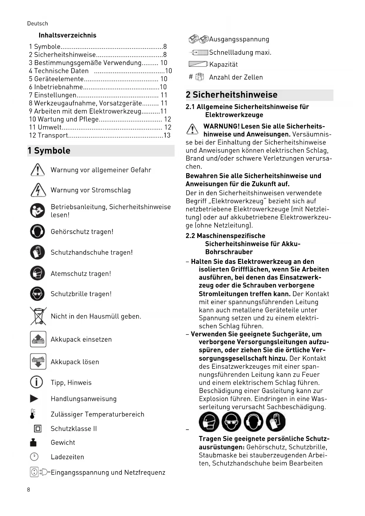 - 12 Transport 1 Symbole Warnung vor allgemeiner Gefahr Warnung vor Stromschlag Betriebsanleitung, Sicherheitshinweise lesen! Gehörschutz tragen! Schutzhandschuhe tragen! Atemschutz tragen! Schutzbrille tragen! Nicht in den Hausmüll geben. Akkupack einsetzen Akkupack lösen Tipp, Hinweis Handlungsanweisung Zulässiger Temperaturbereich Schutzklasse II Gewicht Ladezeiten Eingangsspannung und Netzfrequenz Ausgangsspannung Schnellladung maxi. Kapazität p. 13