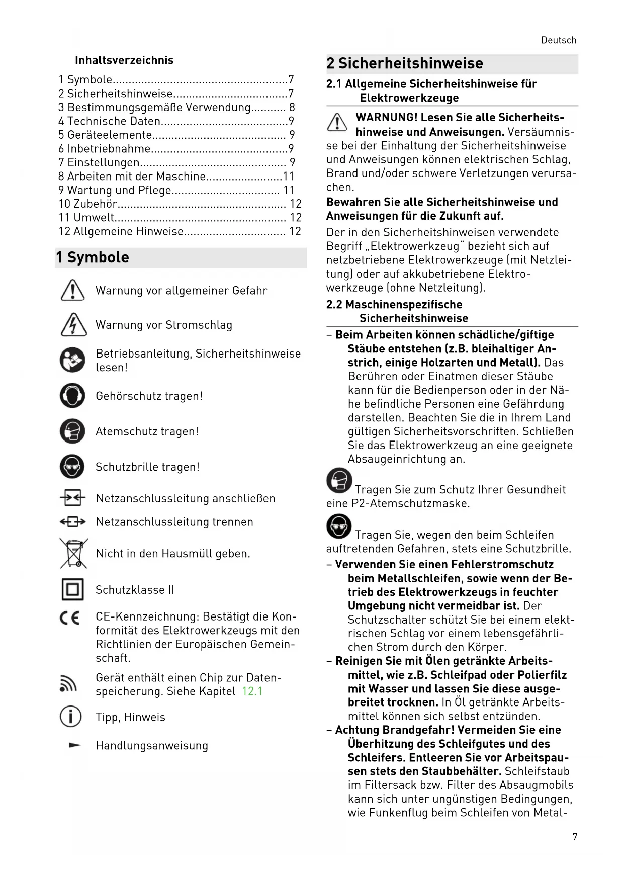 - 12 Allgemeine Hinweise 1 Symbole Warnung vor allgemeiner Gefahr Warnung vor Stromschlag Betriebsanleitung, Sicherheitshinweise lesen! Gehörschutz tragen! Atemschutz tragen! Schutzbrille tragen! Netzanschlussleitung anschließen Netzanschlussleitung trennen Nicht in den Hausmüll geben. Schutzklasse II CE-Kennzeichnung: Bestätigt die Kon formität des Elektrowerkzeugs mit den Richtlinien der Europäischen Gemein schaft. Gerät enthält einen Chip zur Daten speicherung. Siehe Kapitel 12.1 Tipp, Hinweis Handlungsanweisung 2 Sicherheitshinweise p. 12
