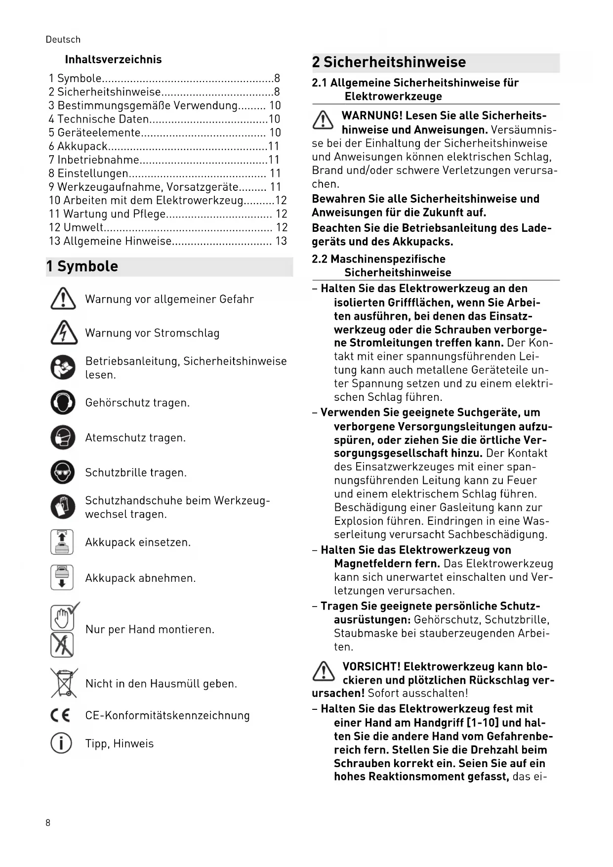 - 13 Allgemeine Hinweise 1 Symbole Warnung vor allgemeiner Gefahr Warnung vor Stromschlag Betriebsanleitung, Sicherheitshinweise lesen. Gehörschutz tragen. Atemschutz tragen. Schutzbrille tragen. Schutzhandschuhe beim Werkzeug wechsel tragen. Akkupack einsetzen. Akkupack abnehmen. Nur per Hand montieren. Nicht in den Hausmüll geben. CE-Konformitätskennzeichnung Tipp, Hinweis 2 Sicherheitshinweise p. 13