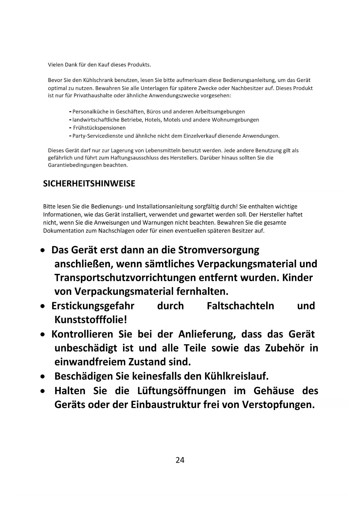 Vielen Dank für den Kauf dieses Produkts. Bevor Sie den Kühlschrank benutzen, lesen Sie bitte aufmerksam diese Bedienungsanleitung, um das Gerät optimal zu nutzen. Bewahren Sie alle Unterlagen für spätere Zwecke oder Nachbesitzer auf. Dieses Produkt ist nur für Privathaushalte oder ähnliche Anwendungszwecke vorgesehen: - Personalküche in Geschäften, Büros und anderen Arbeitsumgebungen - landwirtschaftliche Betriebe, Hotels, Motels und andere Wohnumgebungen - Frühstückspensionen - Party-Servicedienste und ähnliche nicht dem Einzelverkauf dienende Anwendungen. Dieses Gerät darf nur zur Lagerung von Lebensmitteln benutzt werden. Jede andere Benutzung gilt als gefährlich und führt zum Haftungsausschluss des Herstellers. Darüber hinaus sollten Sie die Garantiebedingungen beachten. SICHERHEITSHINWEISE Bitte lesen Sie die Bedienungs- und Installationsanleitung sorgfältig durch! Sie enthalten wichtige Informationen, wie das Gerät installiert, verwendet und gewartet werden soll. Der Hersteller haftet nicht, wenn Sie die Anweisungen und Warnungen nicht beachten. Bewahren Sie die gesamte Dokumentation zum Nachschlagen oder für einen eventuellen späteren Besitzer auf.