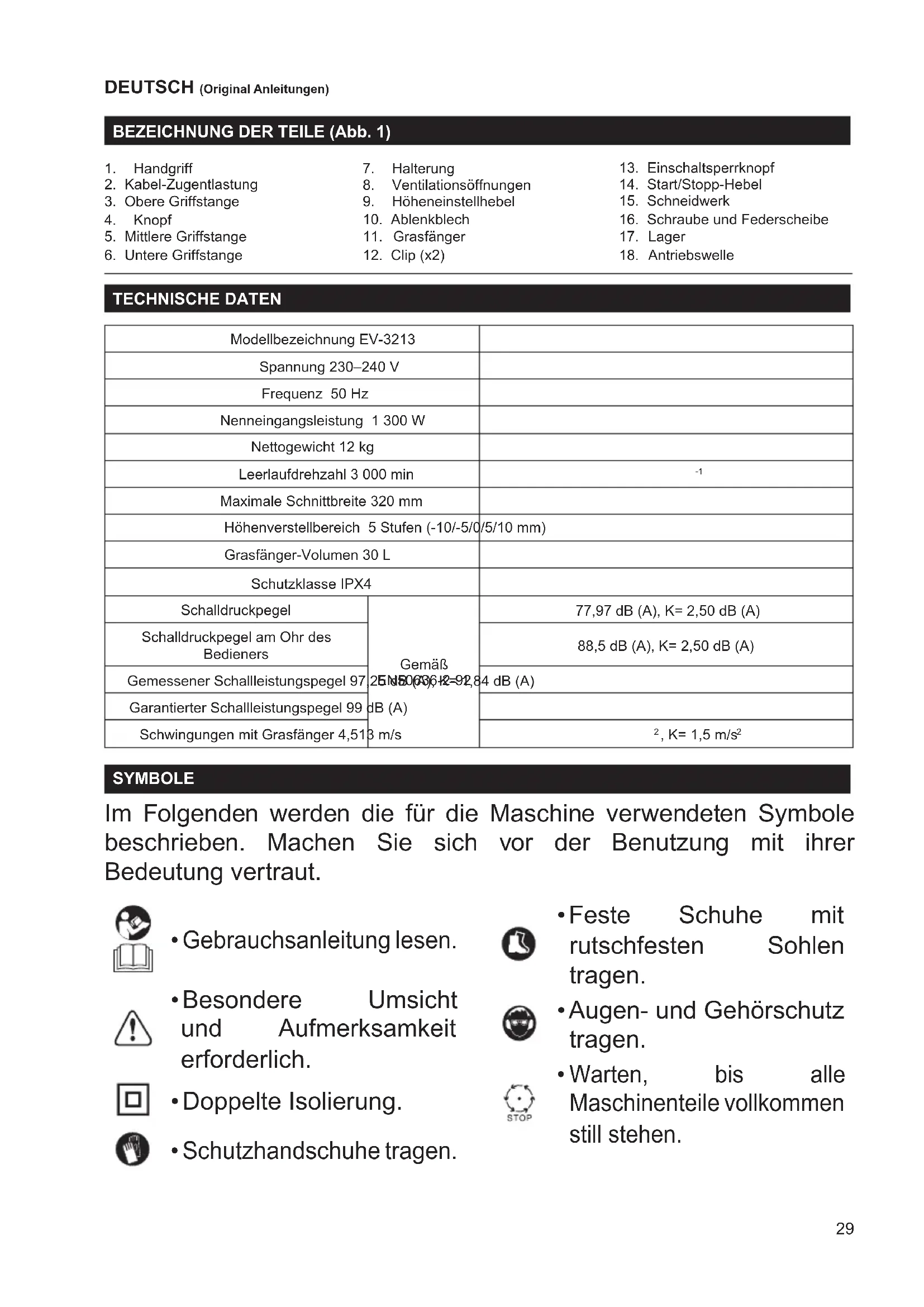 Maximale Schnittbreite 320 mm Höhenverstellbereich 5 Stufen (-10/-5/0/5/10 mm) Grasfänger-Volumen 30 L Schutzklasse IPX4 Schalldruckpegel Gemäß EN50636-2-92 77,97 dB (A), K= 2,50 dB (A) Schalldruckpegel am Ohr des Bedieners 88,5 dB (A), K= 2,50 dB (A) Gemessener Schallleistungspegel 97,25 dB (A), K= 1,84 dB (A) Garantierter Schallleistungspegel 99 dB (A) Schwingungen mit Grasfänger 4,513 m/s
