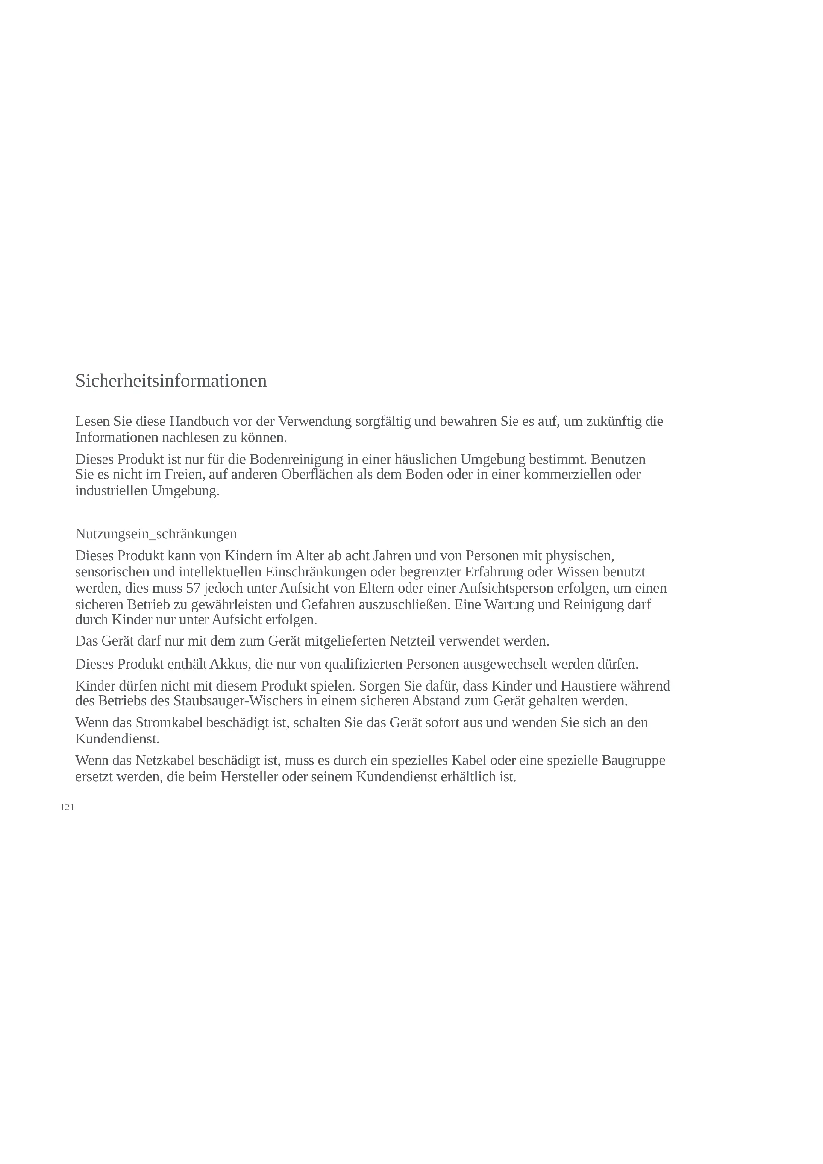 Kinder)dufen nicht mit thisem Produkt spelien. Sorgen Sie davon, dass Kinder und Haustiere wahrend des Betriebs des Staubsauger-Wischers in einem sicheren Abstand zum Gerat gehalten werden.