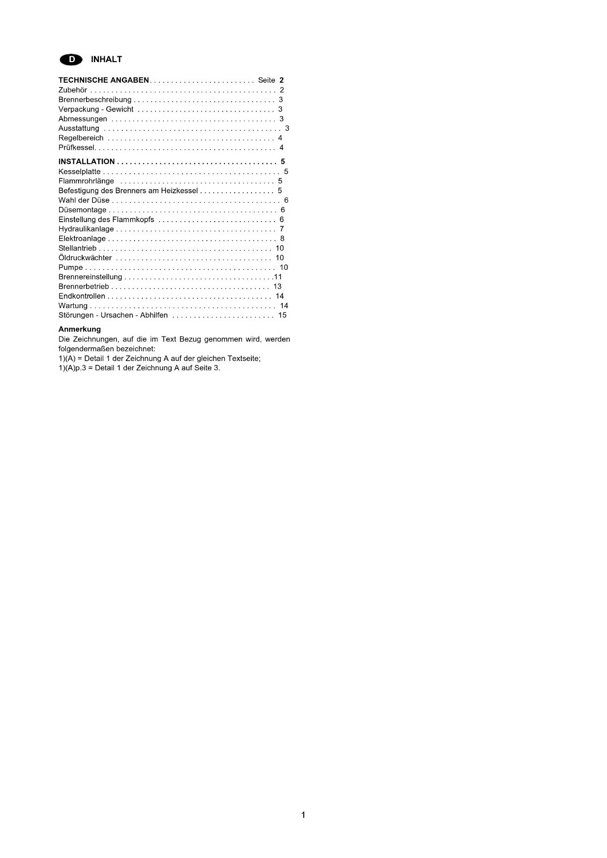 INHALT TECHNISCHE ANGABEN. . . . . . . . . . . . . . . . . . . . . . . . . Seite 2 Zubehör . . . . . . . . . . . . . . . . . . . . . . . . . . . . . . . . . . . . . . . . . . . . 2 Brennerbeschreibung . . . . . . . . . . . . . . . . . . . . . . . . . . . . . . . . . . 3 Verpackung - Gewicht . . . . . . . . . . . . . . . . . . . . . . . . . . . . . . . . . 3 Abmessungen . . . . . . . . . . . . . . . . . . . . . . . . . . . . . . . . . . . . . . . 3 Ausstattung . . . . . . . . . . . . . . . . . . . . . . . . . . . . . . . . . . . . . . . . . 3 Regelbereich . . . . . . . . . . . . . . . . . . . . . . . . . . . . . . . . . . . . . . . . 4 Prüfkessel. . . . . . . . . . . . . . . . . . . . . . . . . . . . . . . . . . . . . . . . . . . 4 INSTALLATION . . . . . . . . . . . . . . . . . . . . . . . . . . . . . . . . . . . . . . 5 Kesselplatte . . . . . . . . . . . . . . . . . . . . . . . . . . . . . . . . . . . . . . . . . 5 Flammrohrlänge . . . . . . . . . . . . . . . . . . . . . . . . . . . . . . . . . . . . . 5 Befestigung des Brenners am Heizkessel . . . . . . . . . . . . . . . . . . 5 Wahl der Düse . . . . . . . . . . . . . . . . . . . . . . . . . . . . . . . . . . . . . . . 6 Düsemontage . . . . . . . . . . . . . . . . . . . . . . . . . . . . . . . . . . . . . . . . 6 Einstellung des Flammkopfs . . . . . . . . . . . . . . . . . . . . . . . . . . . . 6 Hydraulikanlage . . . . . . . . . . . . . . . . . . . . . . . . . . . . . . . . . . . . . . 7 Elektroanlage . . . . . . . . . . . . . . . . . . . . . . . . . . . . . . . . . . . . . . . . 8 Stellantrieb . . . . . . . . . . . . . . . . . . . . . . . . . . . . . . . . . . . . . . . . . 10 Öldruckwächter . . . . . . . . . . . . . . . . . . . . . . . . . . . . . . . . . . . . . 10 Pumpe . . . . . . . . . . . . . . . . . . . . . . . . . . . . . . . . . . . . . . . . . . . . 10 Brennereinstellung . . . . . . . . . . . . . . . . . . . . . . . . . . . . . . . . . . . .11 Brennerbetrieb . . . . . . . . . . . . . . . . . . . . . . . . . . . . . . . . . . . . . . 13 Endkontrollen . . . . . . . . . . . . . . . . . . . . . . . . . . . . . . . . . . . . . . . 14 Wartung . . . . . . . . . . . . . . . . . . . . . . . . . . . . . . . . . . . . . . . . . . . 14 Störungen - Ursachen - Abhilfen . . . . . . . . . . . . . . . . . . . . . . . . 15 Anmerkung Die Zeichnungen, auf die im Text Bezug genommen wird, werden folgendermaßen bezeichnet: 1)(A) = Detail 1 der Zeichnung A auf der gleichen Textseite; 1)(A)p.3 = Detail 1 der Zeichnung A auf Seite 3.